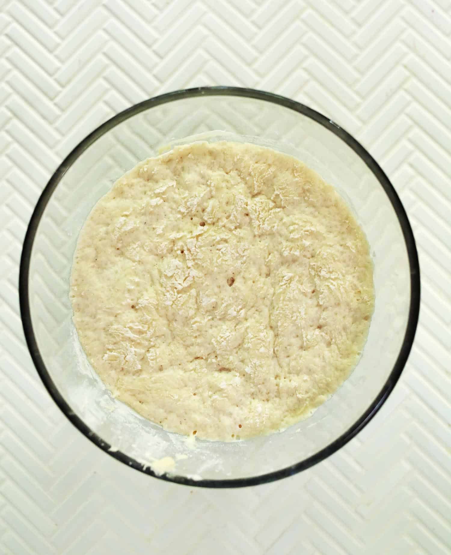 - In a medium to large size bowl, add the flour and salt. Pour the yeast water into the bowl and stir until a dough ball forms. Turn the dough out onto a floured surface and knead a few times to help the dough stick together. Then, place the dough back into the bowl, sprinkle with some flour so it doesn't stick too much, cover with a kitchen towel and allow to rise for 30-40 minutes until doubled in size. If your kitchen is cold or drafty (like mine is the winter), you can place the bowl inside a slightly warmed oven to rise.