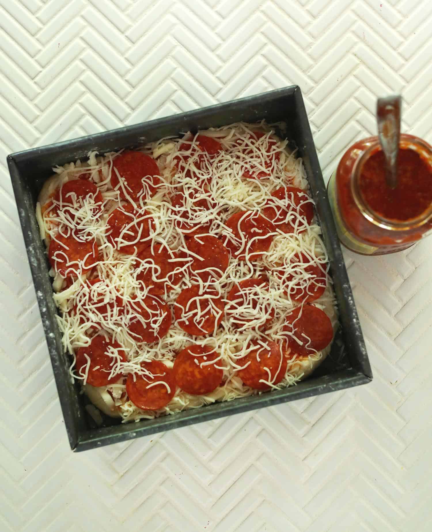 - Oil the inside of an eight-inch square pan. Then, turn the dough out onto a lightly floured surface and roll into a small square. Place the dough in the oiled pan. Top with the sauce, cheese, and toppings. Make sure to sprinkle the cheese all the way to the edge, so it touches the pan (this will let it get crispy as it bakes).