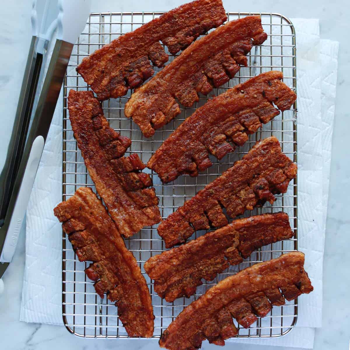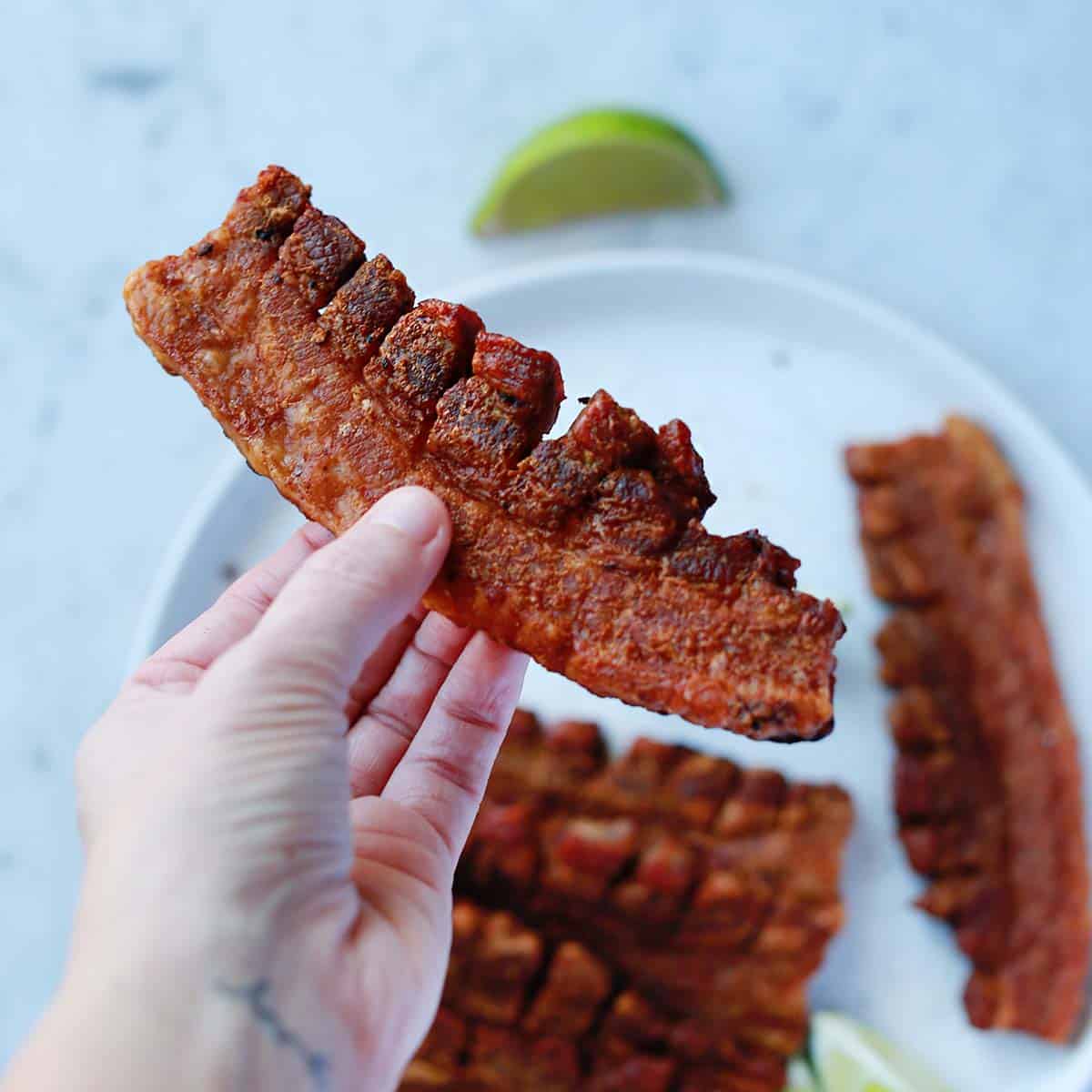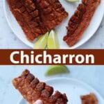 If you love crispy bacon or pork rinds, I highly recommend you try this chicharrón recipe! Chicharrones are an appetizer or snack made of crispy pork belly. Much like thick cut bacon, you can fry these on the stove top or bake in the oven. I think the oven method is much easier and results in this crunchy, salty and flavor-packed dish! You can enjoy chicharrones all on their own with a little fresh lime juice, or use in other recipes like chopped up over pasta, salad, rice dishes or even in ramen.