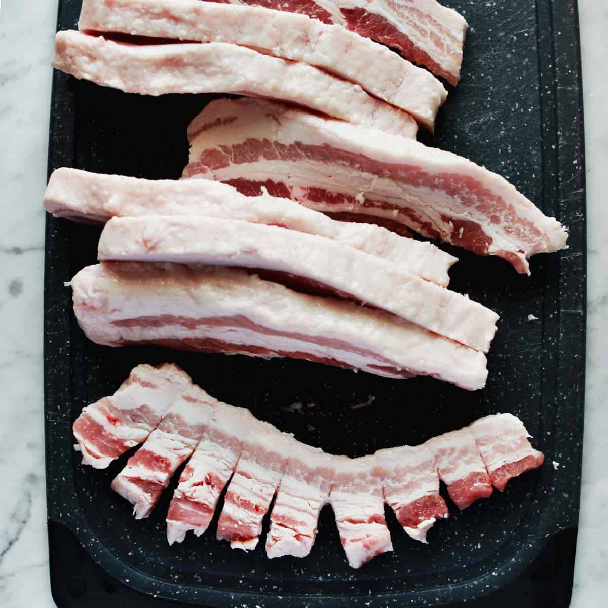 - Cut the pork belly into roughly 1/2-inch (1.3 cm) strips. Try to keep them relatively uniform, but it’s OK if they aren’t all exactly the same thickness. Then cut notches along the bottom.