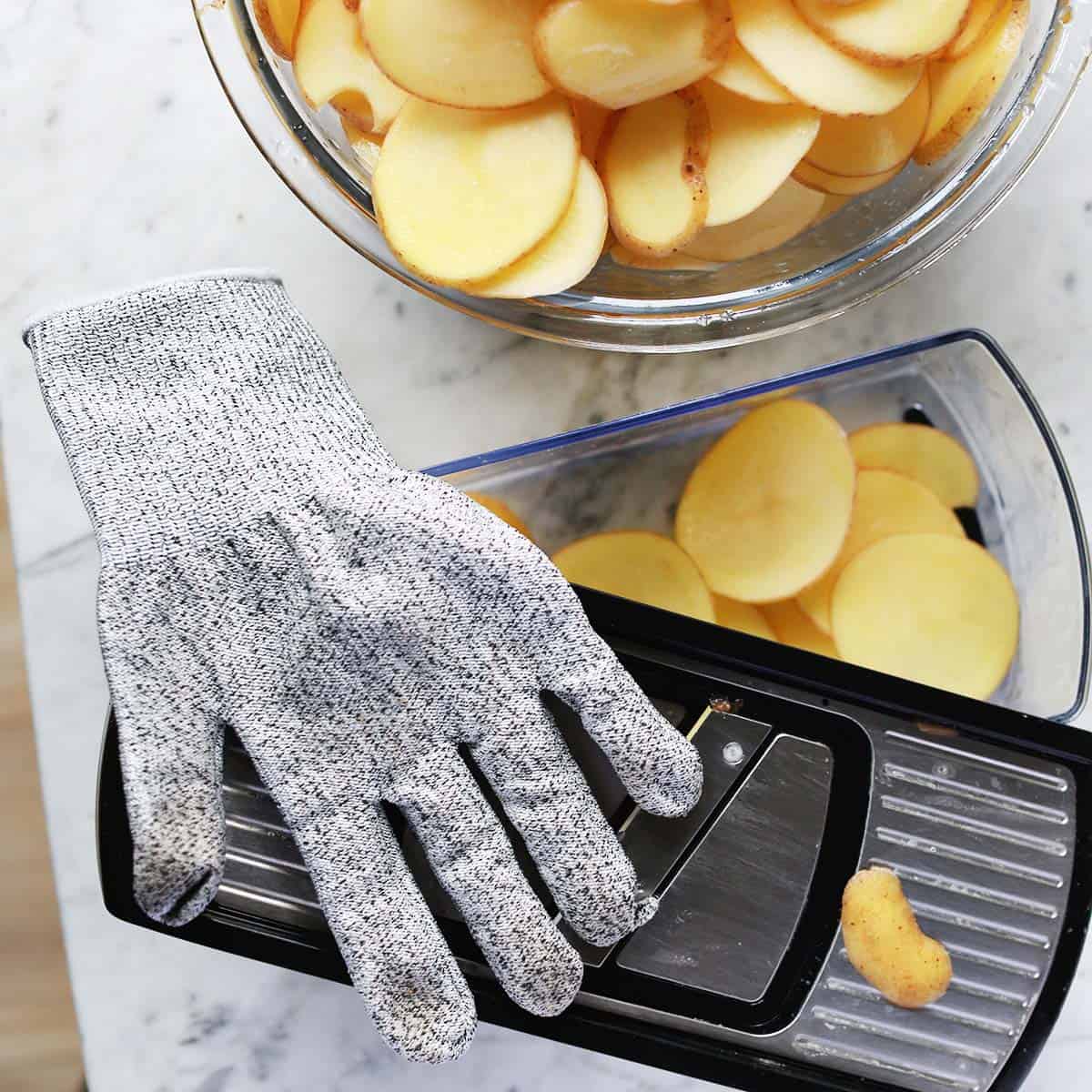 - While I do recommend a mandoline (this one comes with different blades and a glove!), you certainly can cut the potatoes by hand with a good quality knife. If you do, try to keep the slices as uniform in thickness as you can so they will all bake to the same tenderness. You don’t want some thick pieces that end up feeling undercooked.