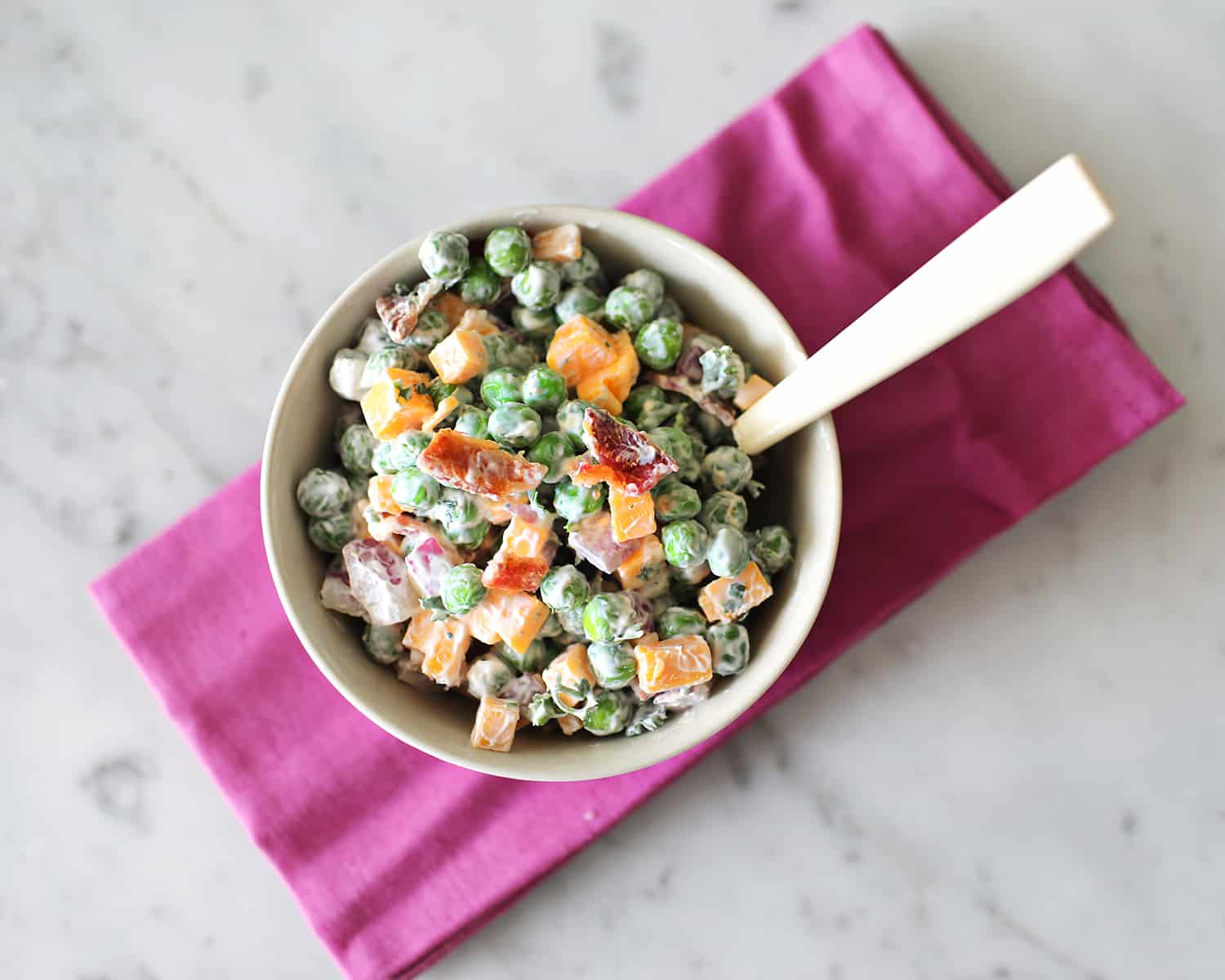This classic pea salad reminds me of something my grandmother would have served— in the best possible way. It’s a nostalgic recipe that begs to be served with watermelon and hot dogs.