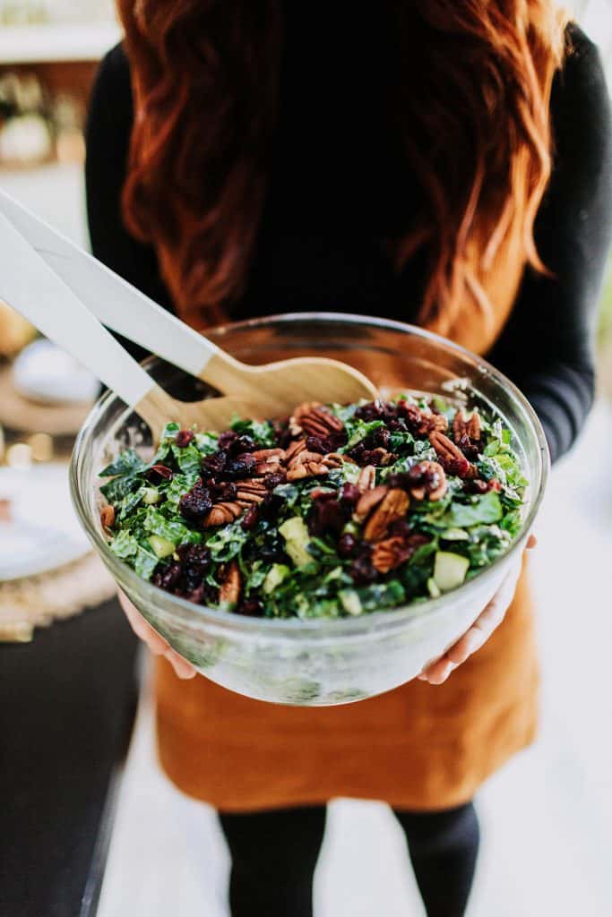 This salad is creamy and packed with flavor. Ingredients include Granny Smith apples, pecans, dried cranberries, avocados, and kale.