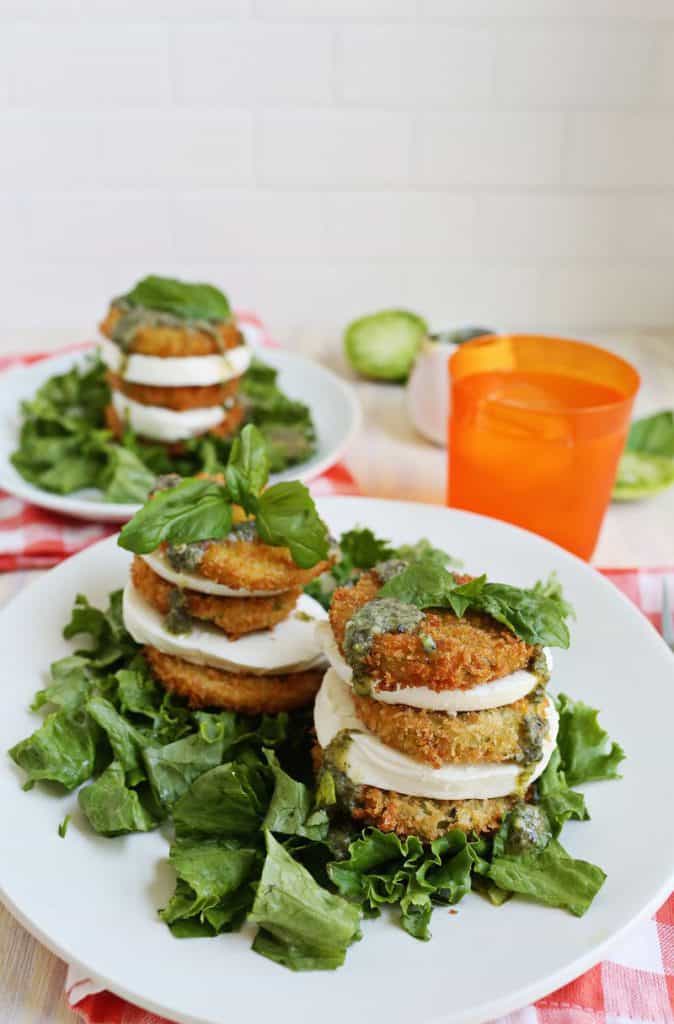 This delicious salad is made with green tomatoes, flour, eggs, bread crumbs, spinach, and fresh mozzarella. Then you top it with pesto dressing.