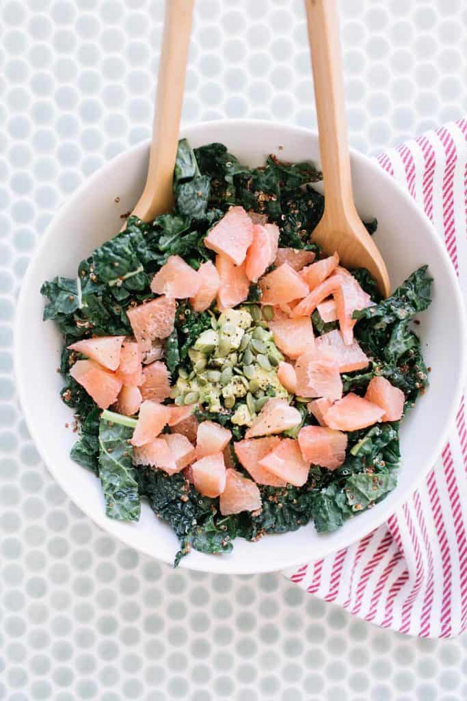 This salad has kale, red quinoa, grapefruit, avocado, and pumpkin seeds. It’s light and full of good-for-you ingredients but still super flavorful and absolutely beautiful sitting on a table.