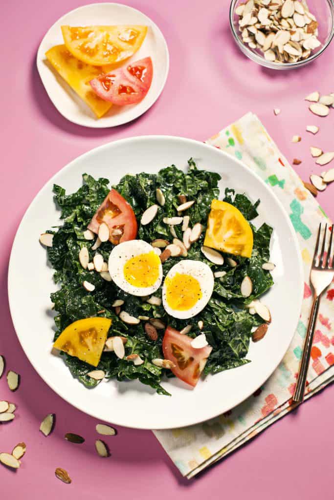 Some days you just need a good salad that is filling, flavor packed, and hearty. This salad is kale, almonds, and boiled eggs.