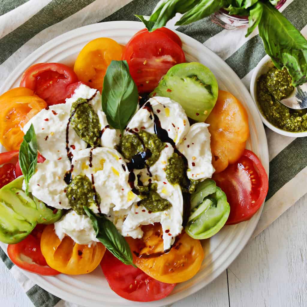 Learn to make a Burrata and tomato salad using fresh burrata, heirloom tomatoes, basil, balsamic glaze, olive oil and pesto. This recipe is so fresh and delicious!