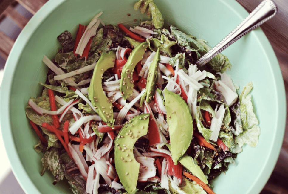 This delicious sushi salad has lettuce, crab, avocado, lemon, sriracha, wasabi sauce, mayonnaise, sesame seeds, and seaweed sheets.