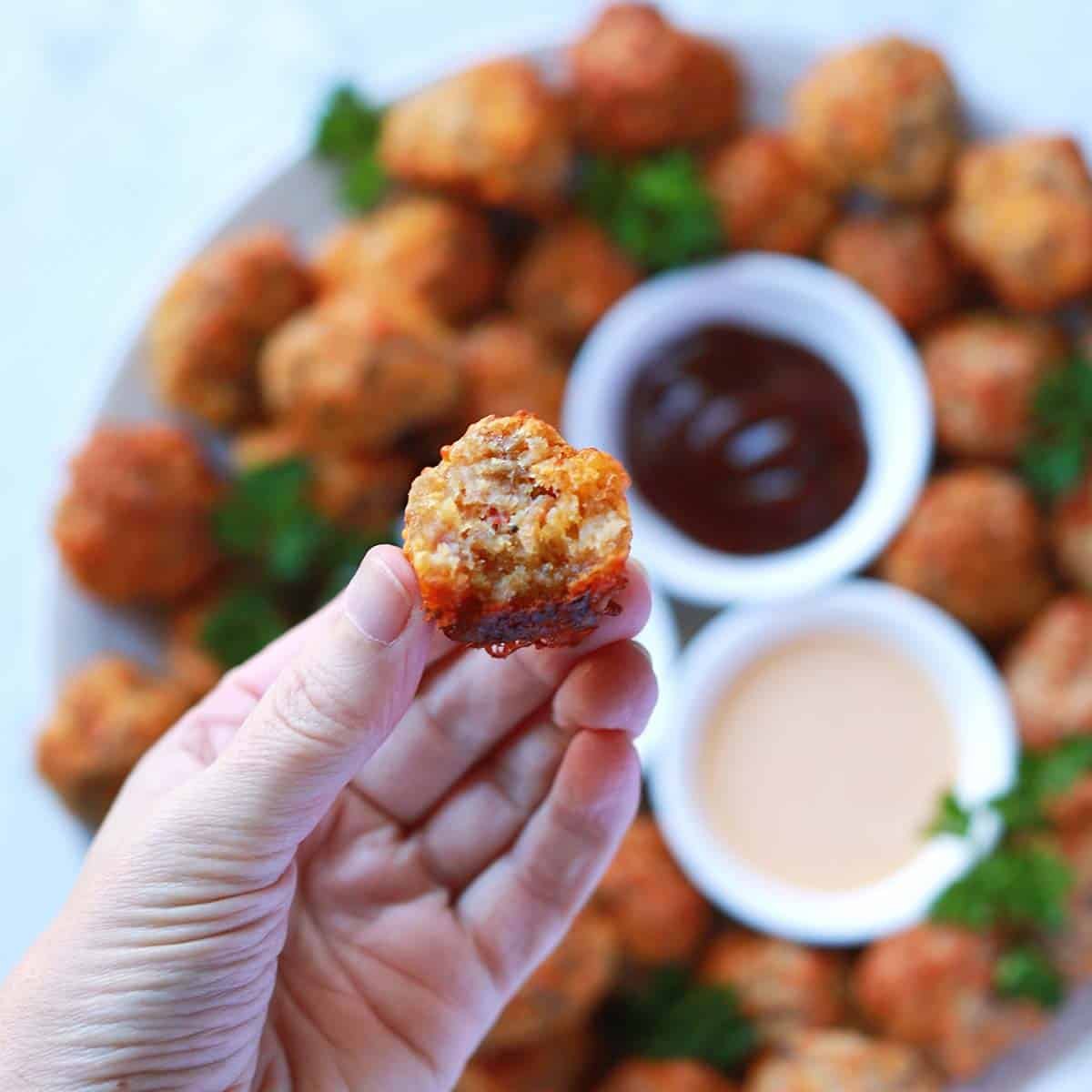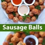 This sausage balls recipe is what I consider PEAK Pinterest-mom food. Lol. It’s so easy to make—there are only four ingredients and you just mix, shape and bake. And these sausage balls are so, SO delicious! They are truly addictive, you have been warned. One bite and you’ll be hooked. No matter if you serve them as a holiday appetizer or as part of a potluck meal, they will get devoured quickly.