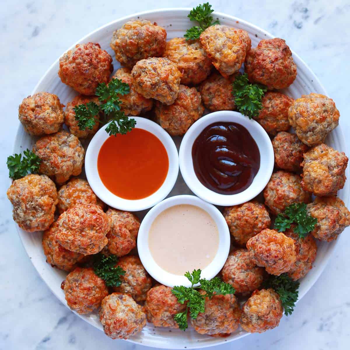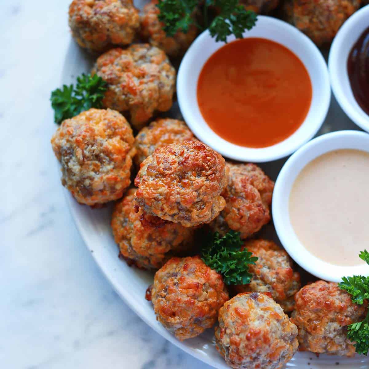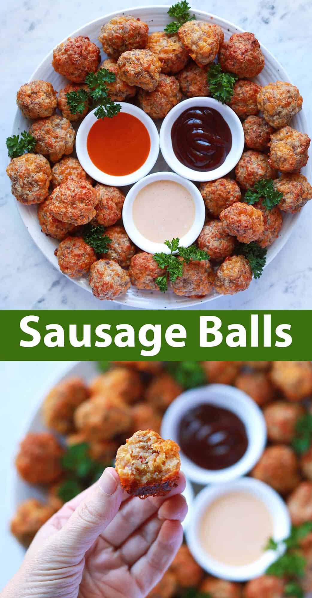 - I like these sausage balls as is, but it’s fun to serve them with a dipping sauce for those who might want one. I recommend BBQ sauce, buffalo sauce, honey mustard, ranch dressing or yum sauce.