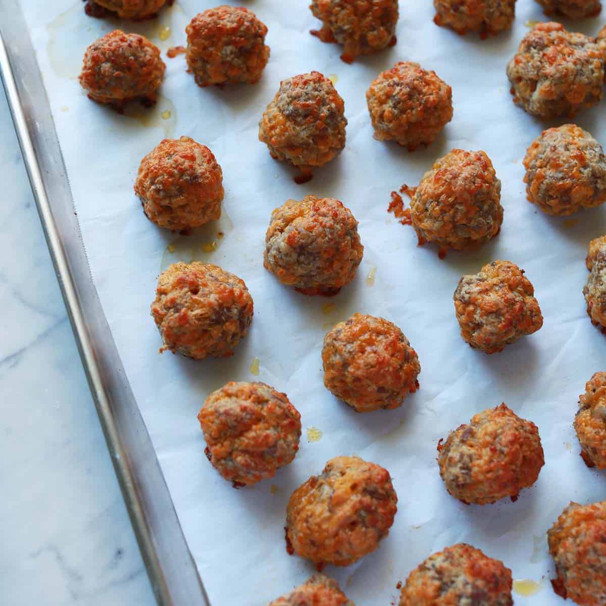 - You can make these a day or two ahead of time and simply cover and refrigerate uncooked sausage balls until you’re ready to bake.