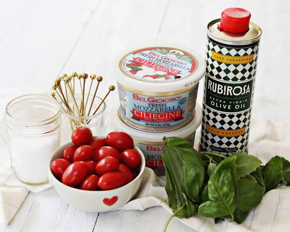 - Mozzarella Balls – We used mini mozzarella balls or ciliegine mozzarella (grape tomatoes or cherry tomatoes). If these aren’t available at your grocery store, you can also chop fresh mozzarella cheese into small cubes.