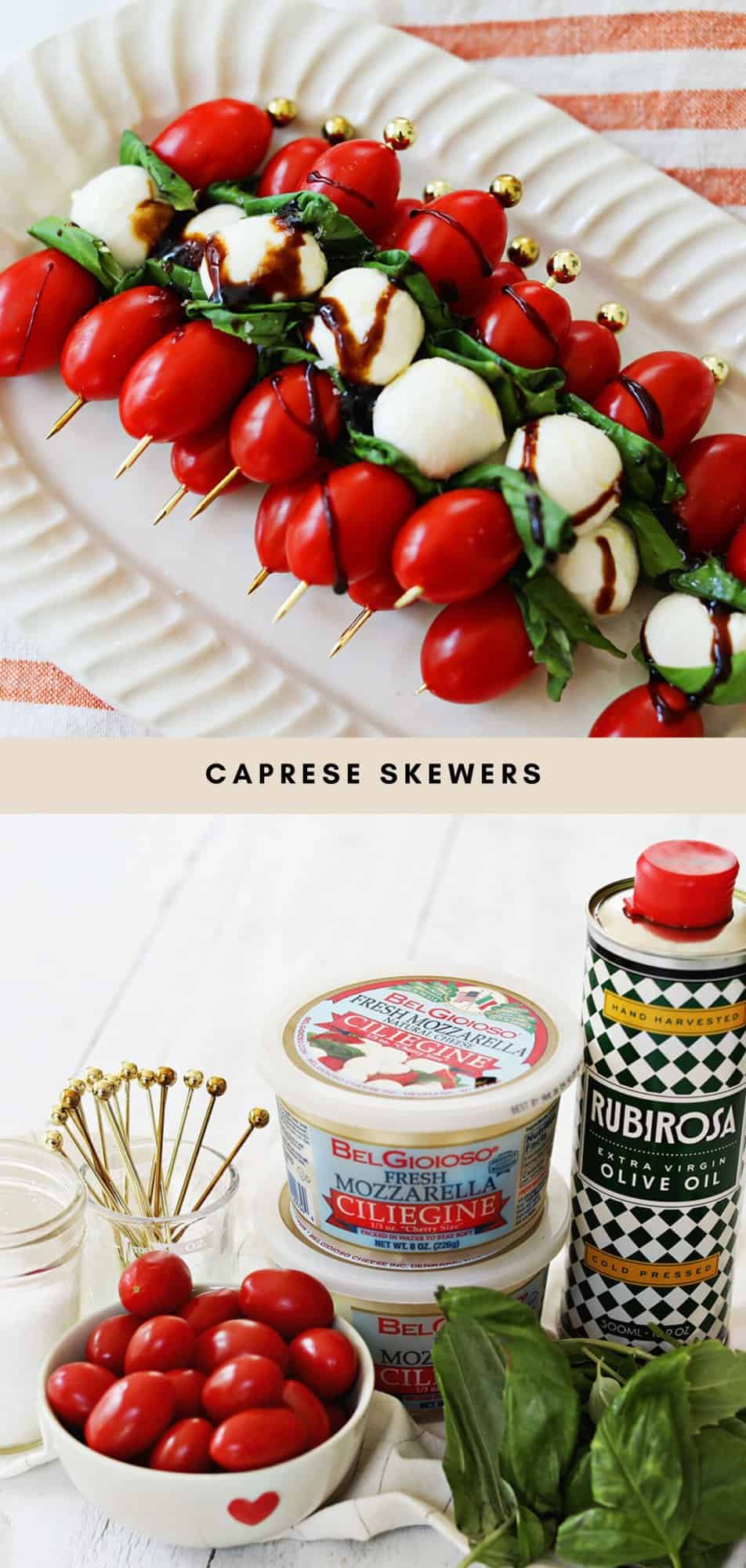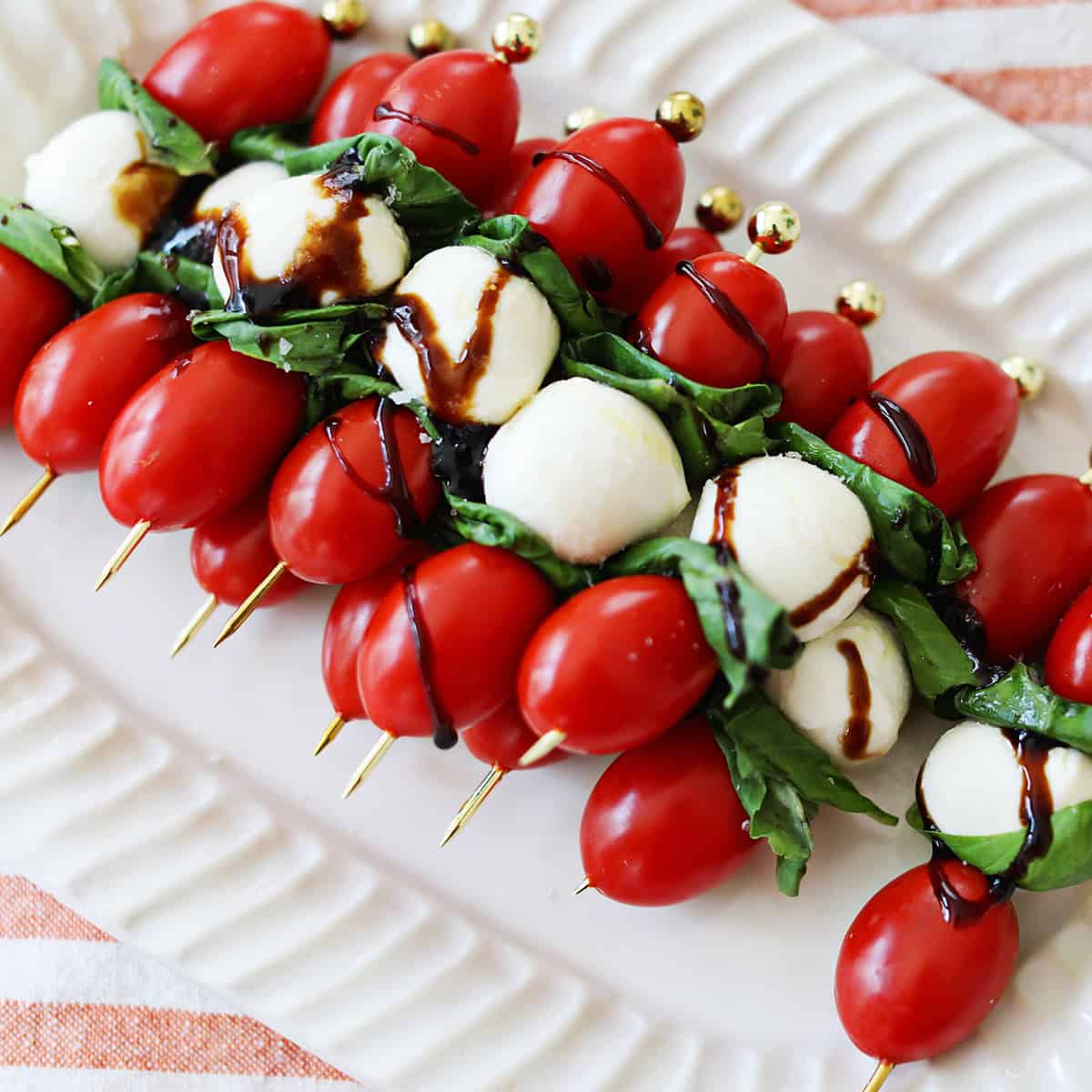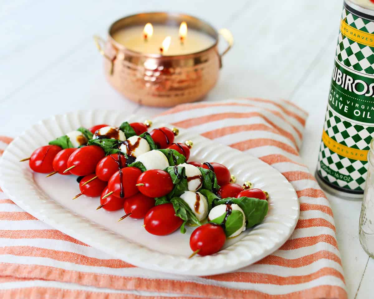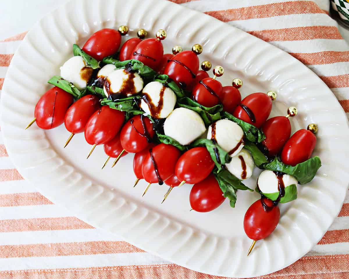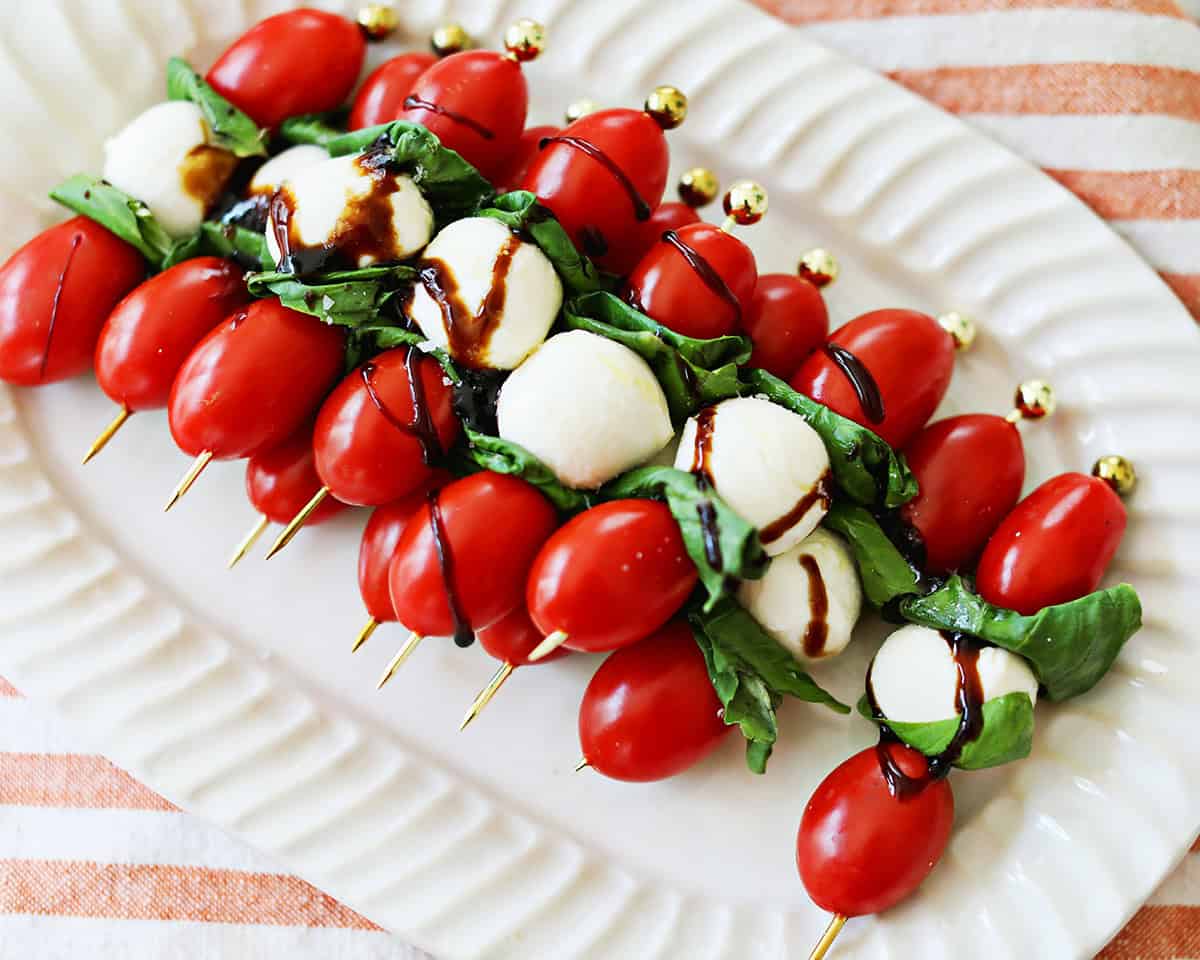 Caprese Skewers are a delicious, easy to prepare appetizer made with fresh mozzarella balls, tomatoes and basil leaves. These caprese bites make a great appetizer for your next gathering, including holiday parties!