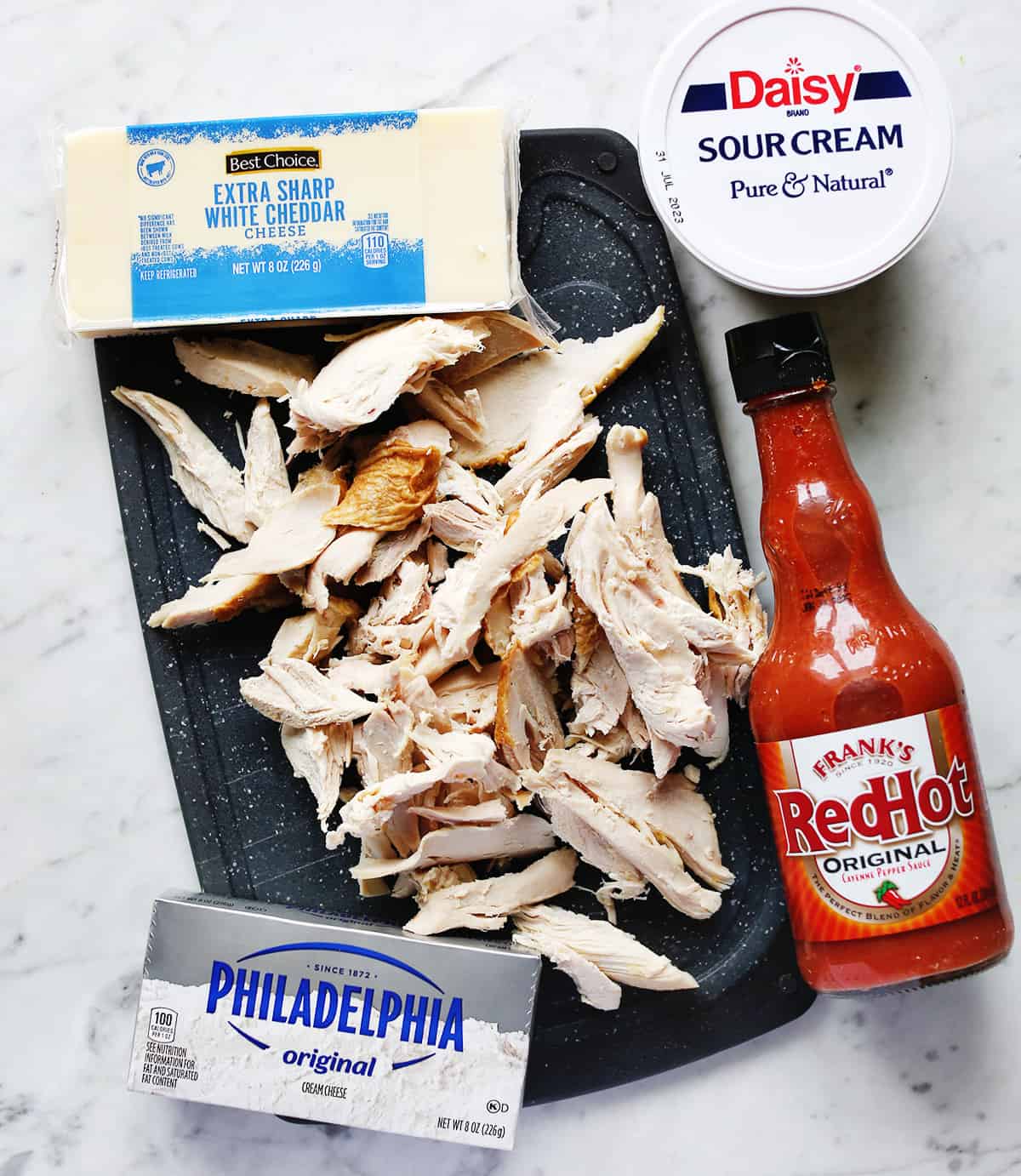 Chicken, hot sauce, cream cheese, sour cream, and cheddar.