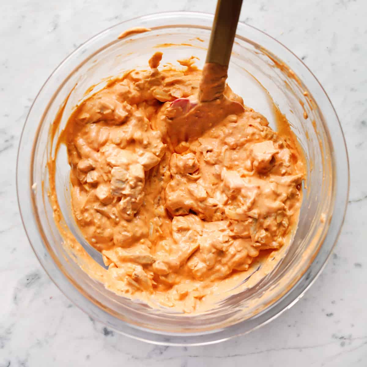 - In a mixing bowl, stir together the hot sauce, softened cream cheese, and sour cream. Then stir in the chicken and half of the shredded cheese.