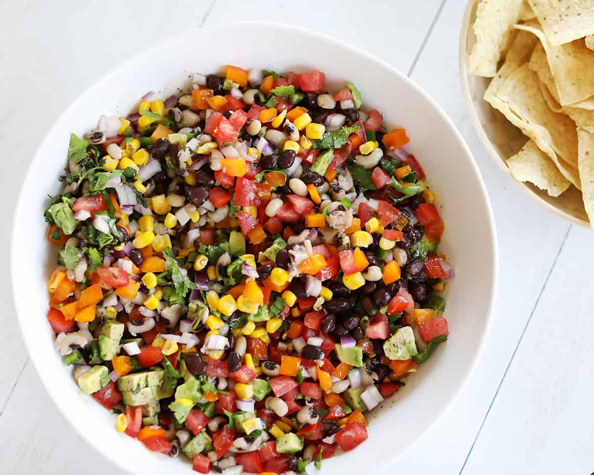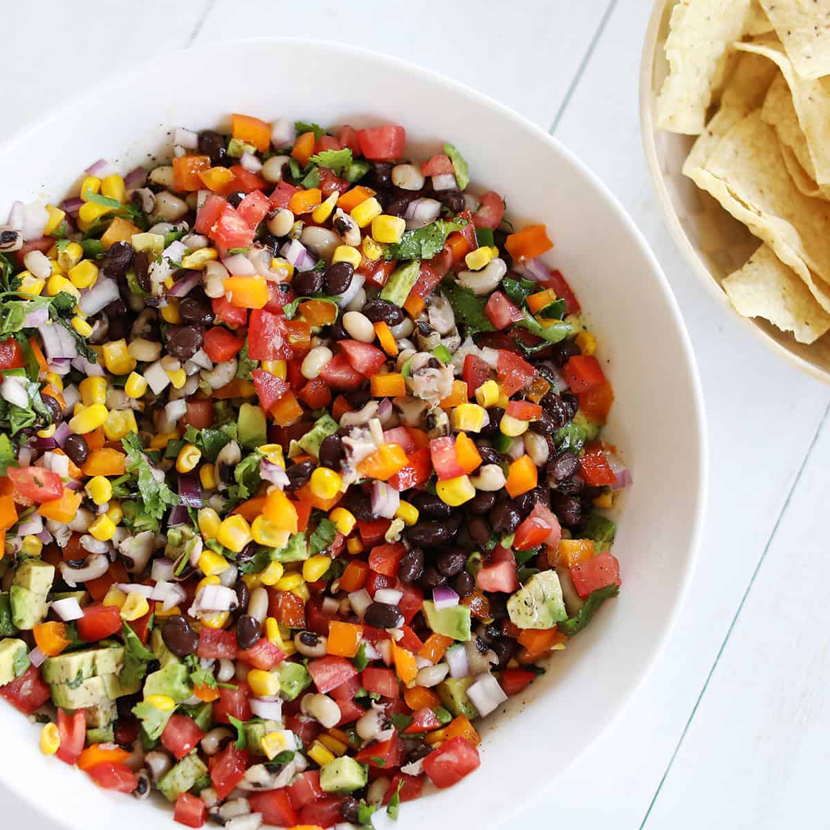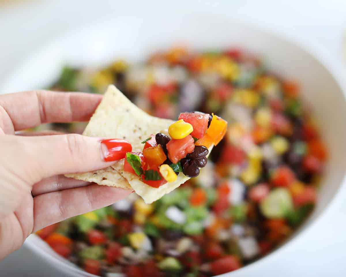This dippable salad recipe is made with tomatoes, peppers, beans, corn, cilantro, onions and avocado.