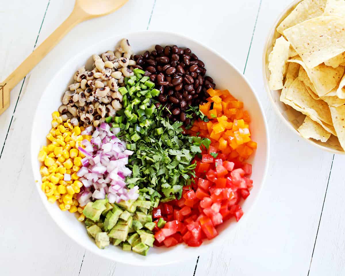 - In a large bowl, combine the tomatoes, avocado, red onion, black beans, black-eyed peas, corn, peppers and cilantro. Gently mix then together until the ingredients are evenly mixed.