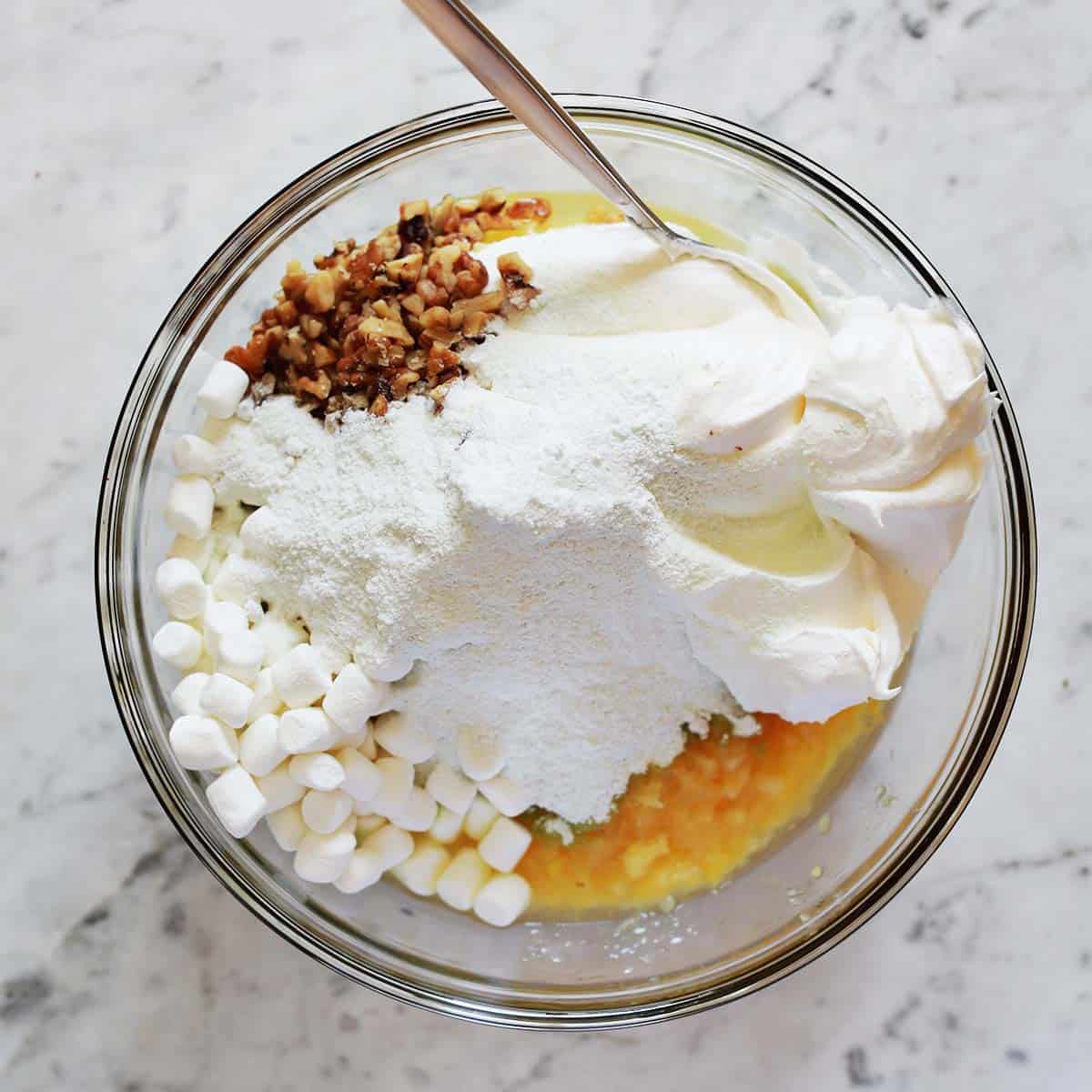 Very similar to Ambrosia salad my Mom always made with sour cream, marshmallows, drained mandarin orange segments and drained pineapple tidbits