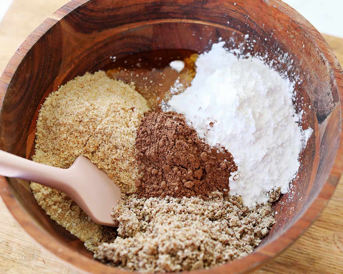 - Add all the dry ingredients (vanilla wafer crumbs, pecan crumbs, powdered suagr, cocoa, a pinch of salt) to a bowl and mix until well combined.