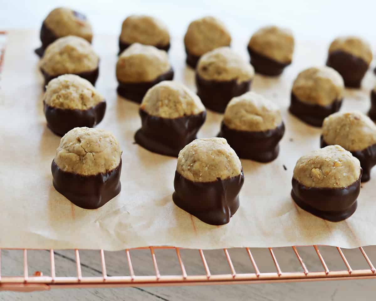 - Roll the dough into balls and place them on a piece of parchment paper. Freeze the balls for at least 10 minutes before moving on to the chocolate coating.