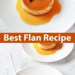 Flan has other names including crème caramel or simply custard. This flan recipe is a version of Spanish flan or crème caramel—a simple caramel topped baked custard. This classic dessert only has five ingredients and it’s super simple to make. I posted this originally years and years ago and have updated it to make it even more simple and straight-forward.