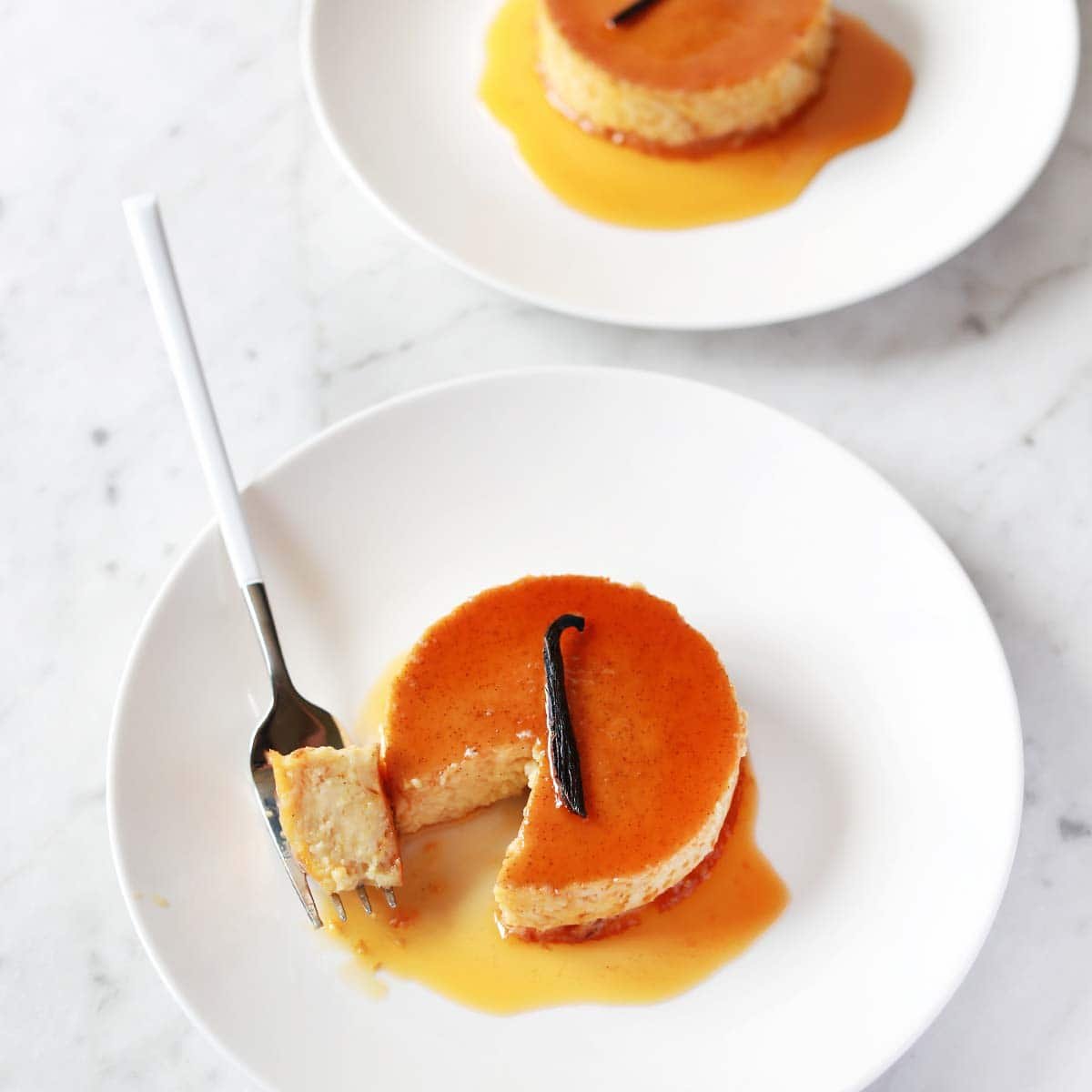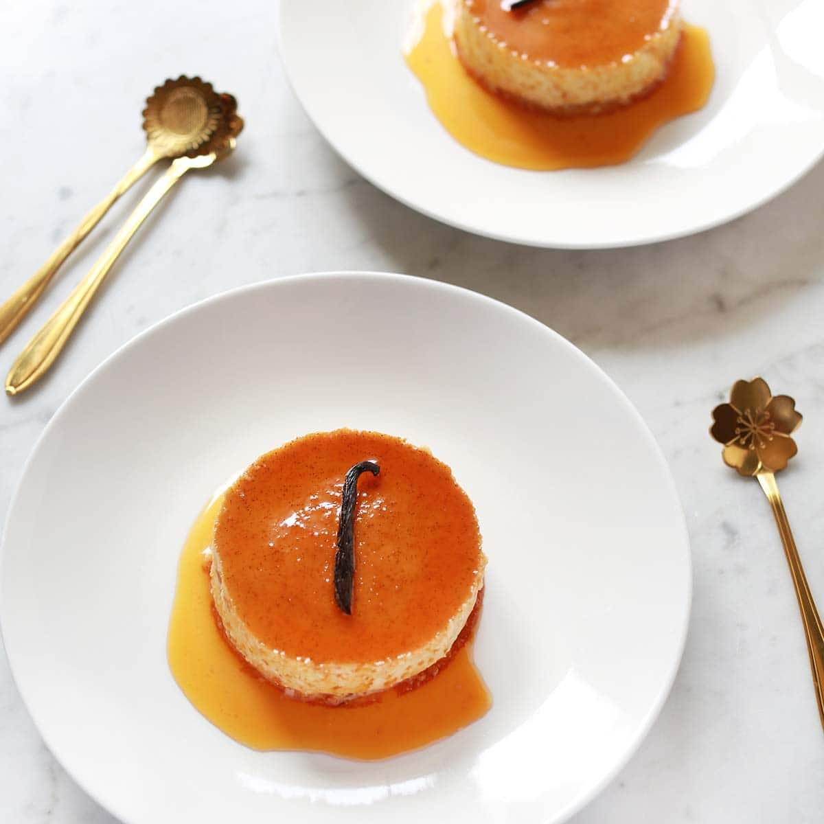 Flan can be served all on it’s own, no styling necessary. But in the above photos you can see I saved the used vanilla bean and styled a few of the flan with that. Another option that I think is super fun is creating crunchy sugar tops to place on top of the flan before serving. The crunchy sugar is a fun juxtaposition to the silky smooth custard—much like crème brûlée.