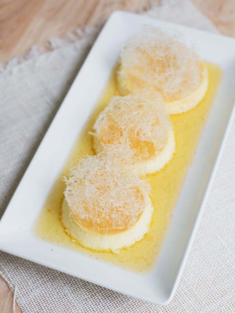 I love the caramel layer that you add into the ramekin before baking, and once you pop the flan out of the cup, you get a nice top, especially with the sugar nests. So cool!!