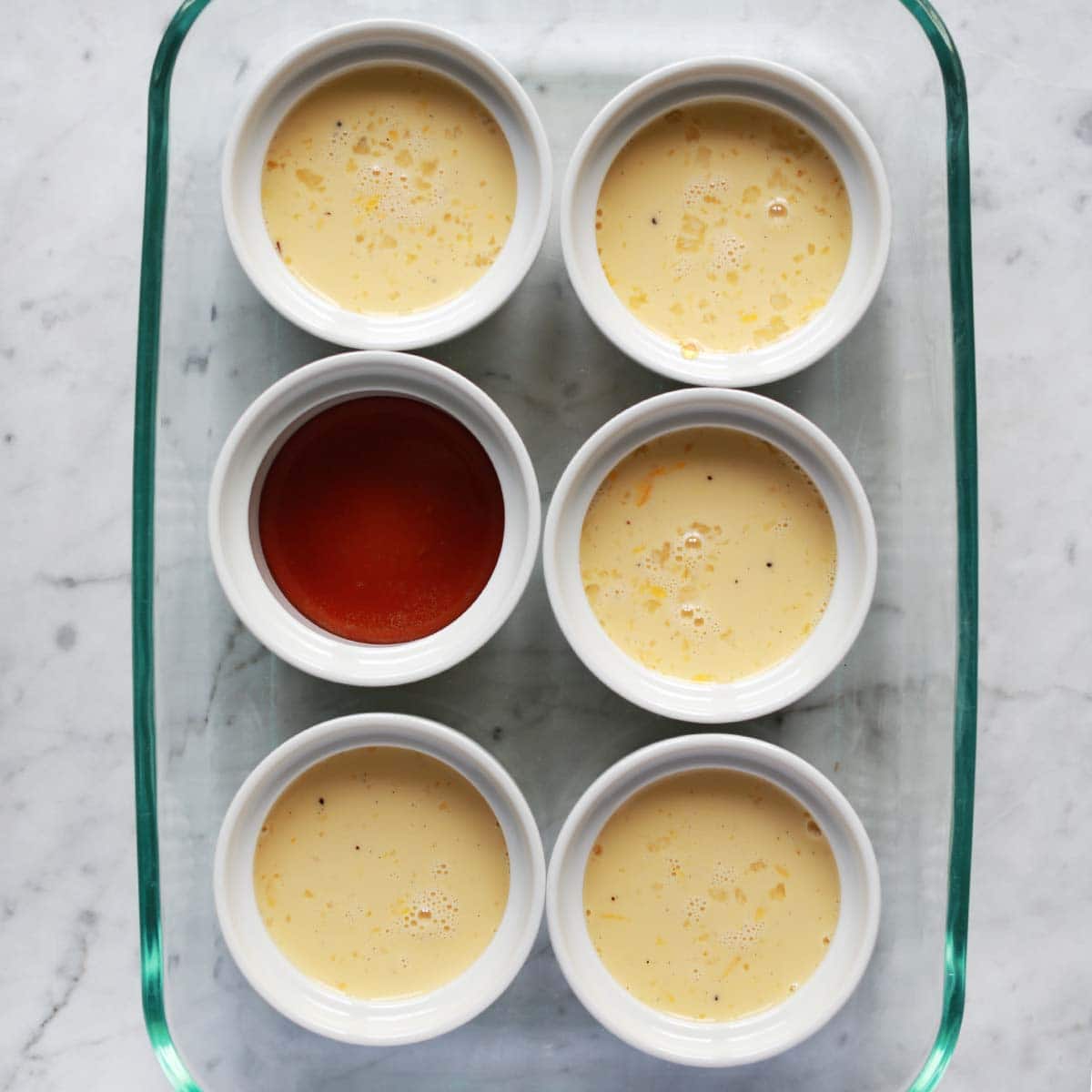 - Remove from heat and pour the liquid into the ramekins, distributing it equally.