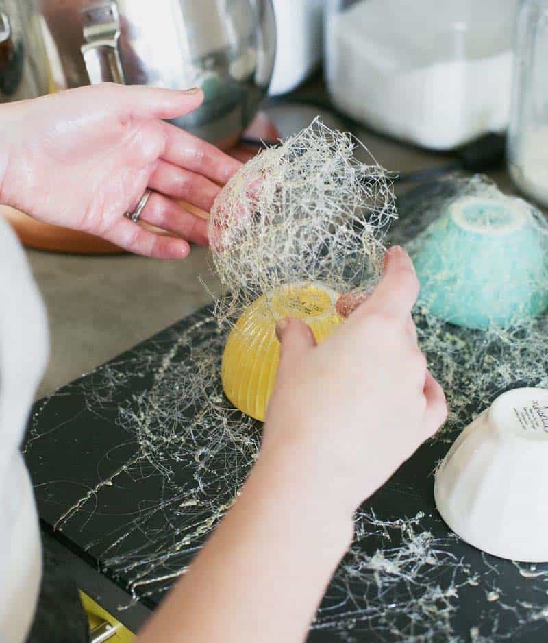 Dip a fork in the mixture. Pull the sugar up over the oiled bowls and wave it around, like a wand. This will stretch the sugar and give it time to cool some as it drops toward the bowls. I like to wear an oven mit while I do this. Always be careful when you work with really hot sugar. Once that cools, lightly oil your clean hands and gently work the spun sugar off the bowls. Lightly press to form small nests; place over the tops of your inverted flans.