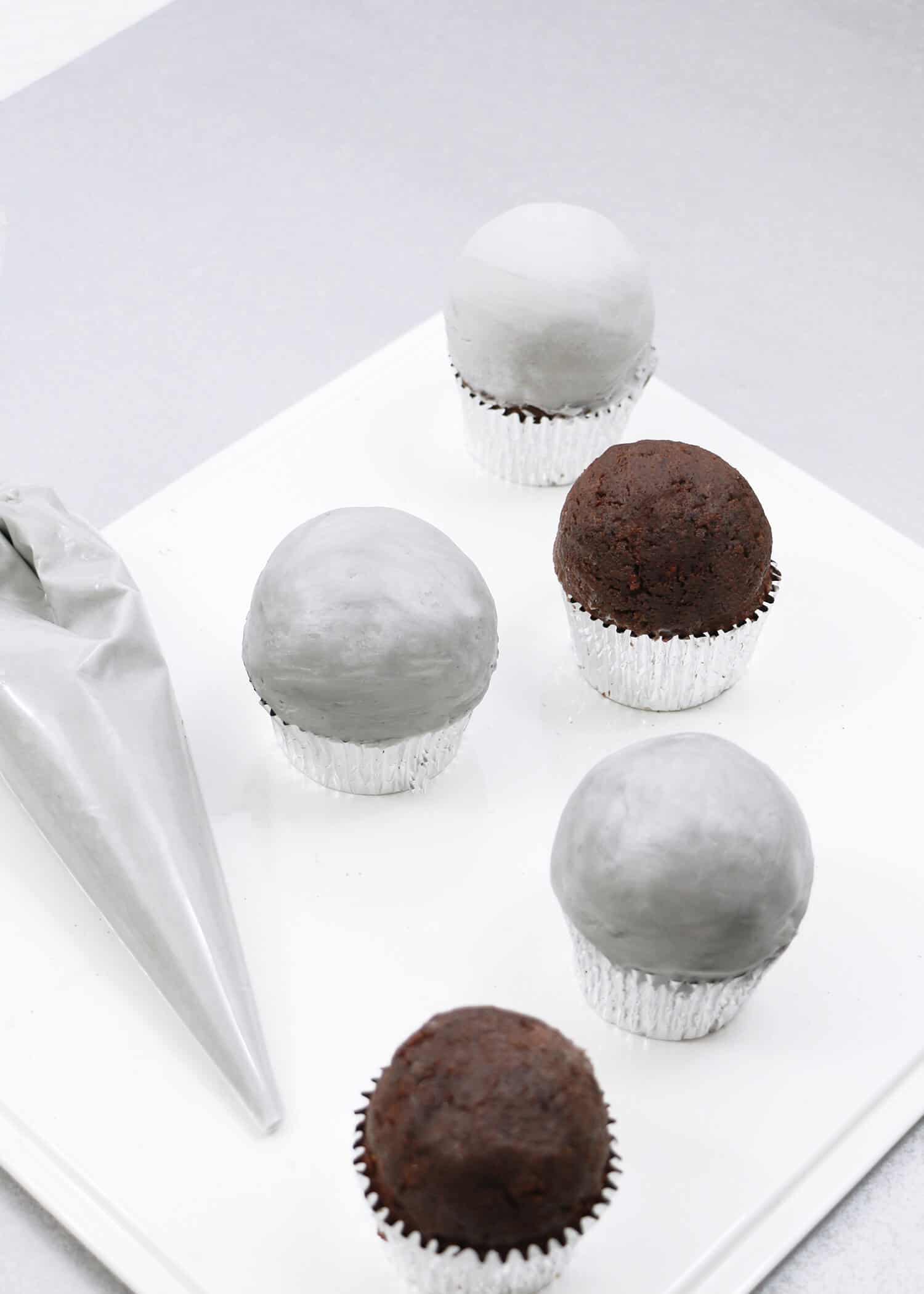 - Lightly frost the top of one of your smaller (more level) cupcakes, and then position the cake ball on top. Use your palm to gently shape the cake ball to a dome shape. Frost with a thin layer of gray buttercream, smooth with a spatula (or your finger), and then place the cupcake in the freezer for 5-10 minutes to allow the frosting to set. Repeat the process with your other cupcakes as well, pairing each of the smaller cupcakes with a larger cupcake for the topper. You’ll notice that once the frosting sets in the freezer it becomes MUCH easier to work with—any uneven spots can easily be smoothed with your fingers once the frosting has firmed.