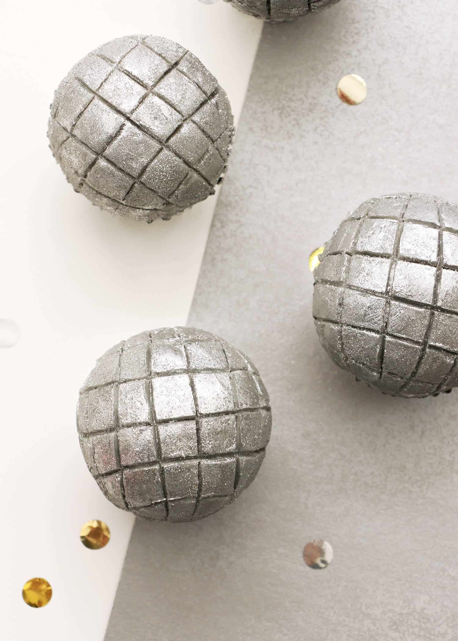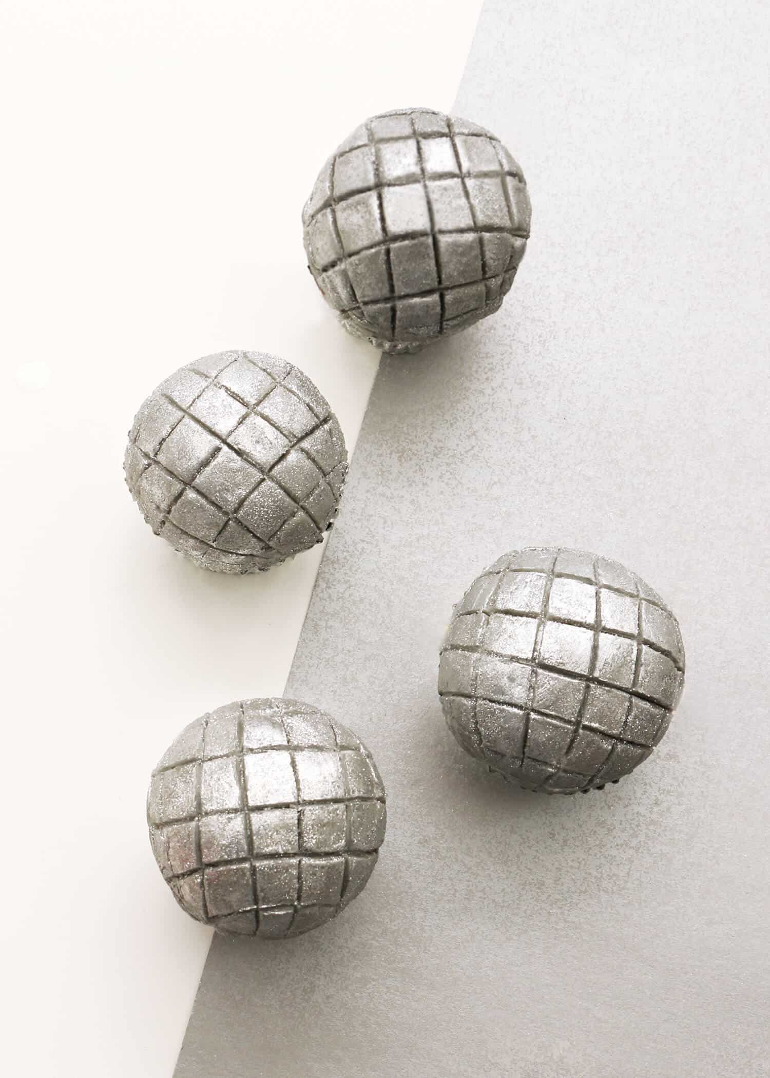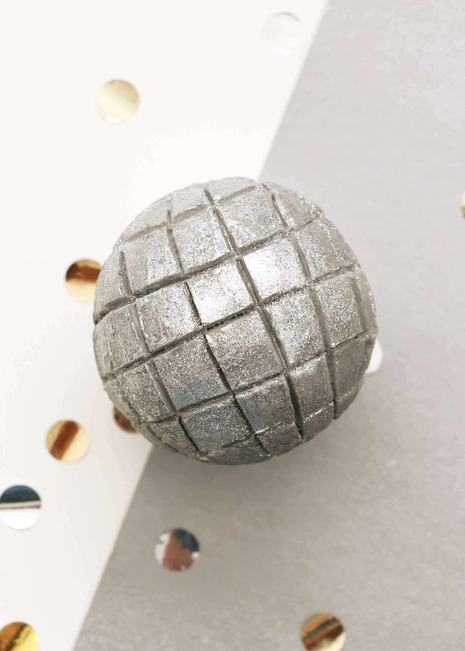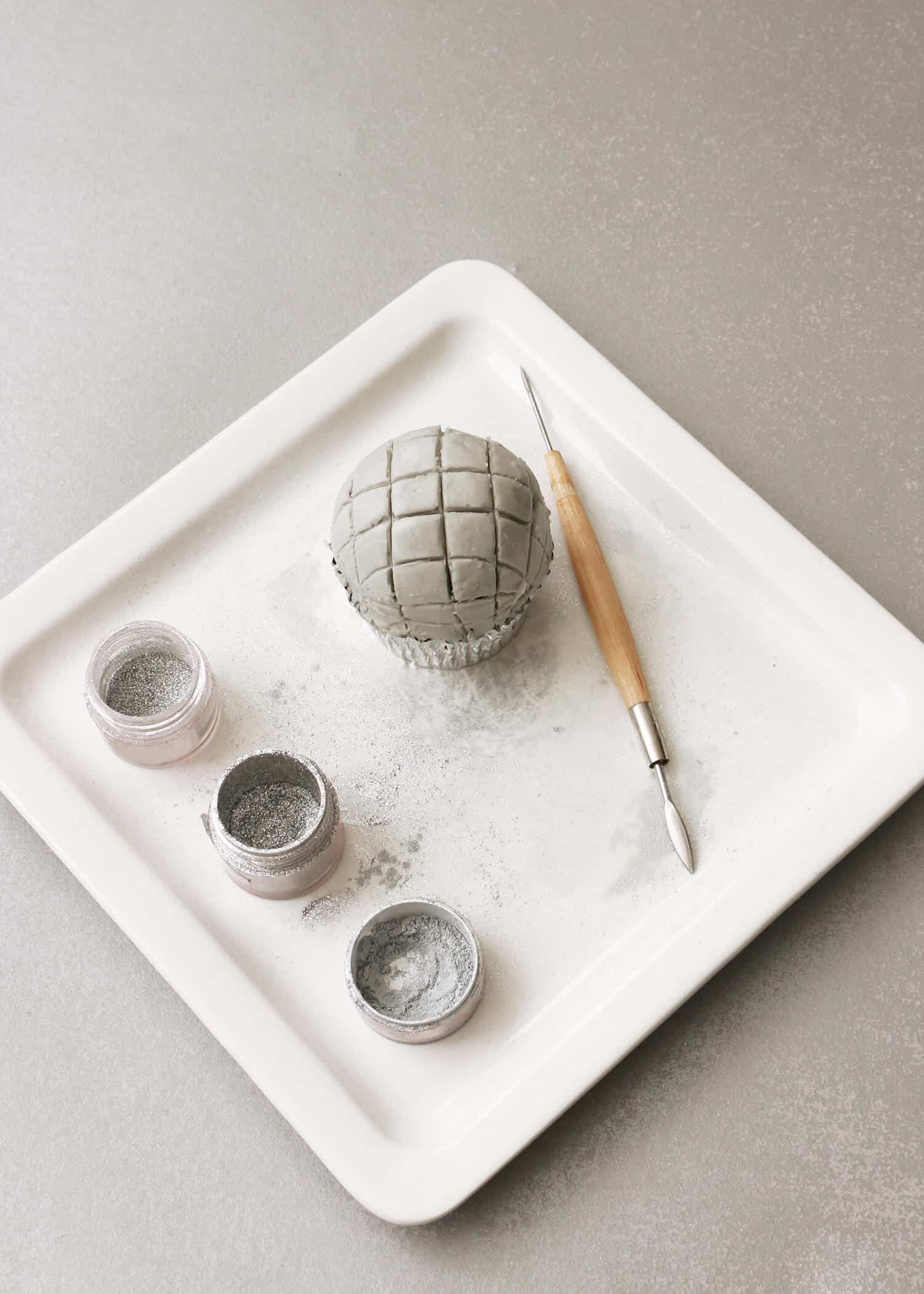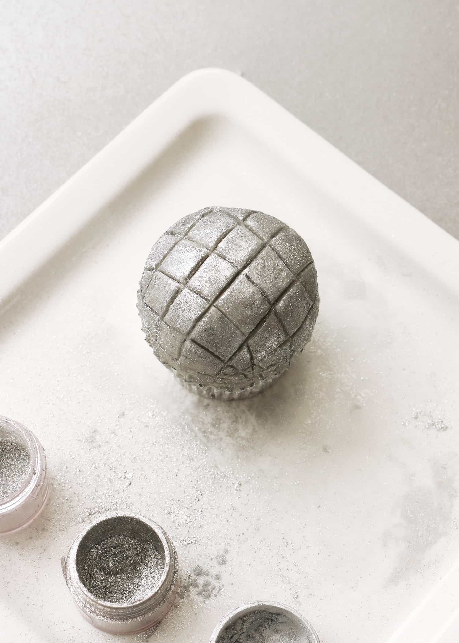 - Once your lines have been made, use your fingertip to add the silver luster dust onto the surface of each cupcake. Make sure the frosting is still cold while you’re doing this. If it’s warmed too much while you were adding the lines, place the cupcake back into the fridge or freezer for a few minutes until the frosting is firm to the touch. And voilà, a disco ball cupcake! Repeat the indenting and glittering steps with your other domed cupcakes until you have a dozen disco balls ready to party!