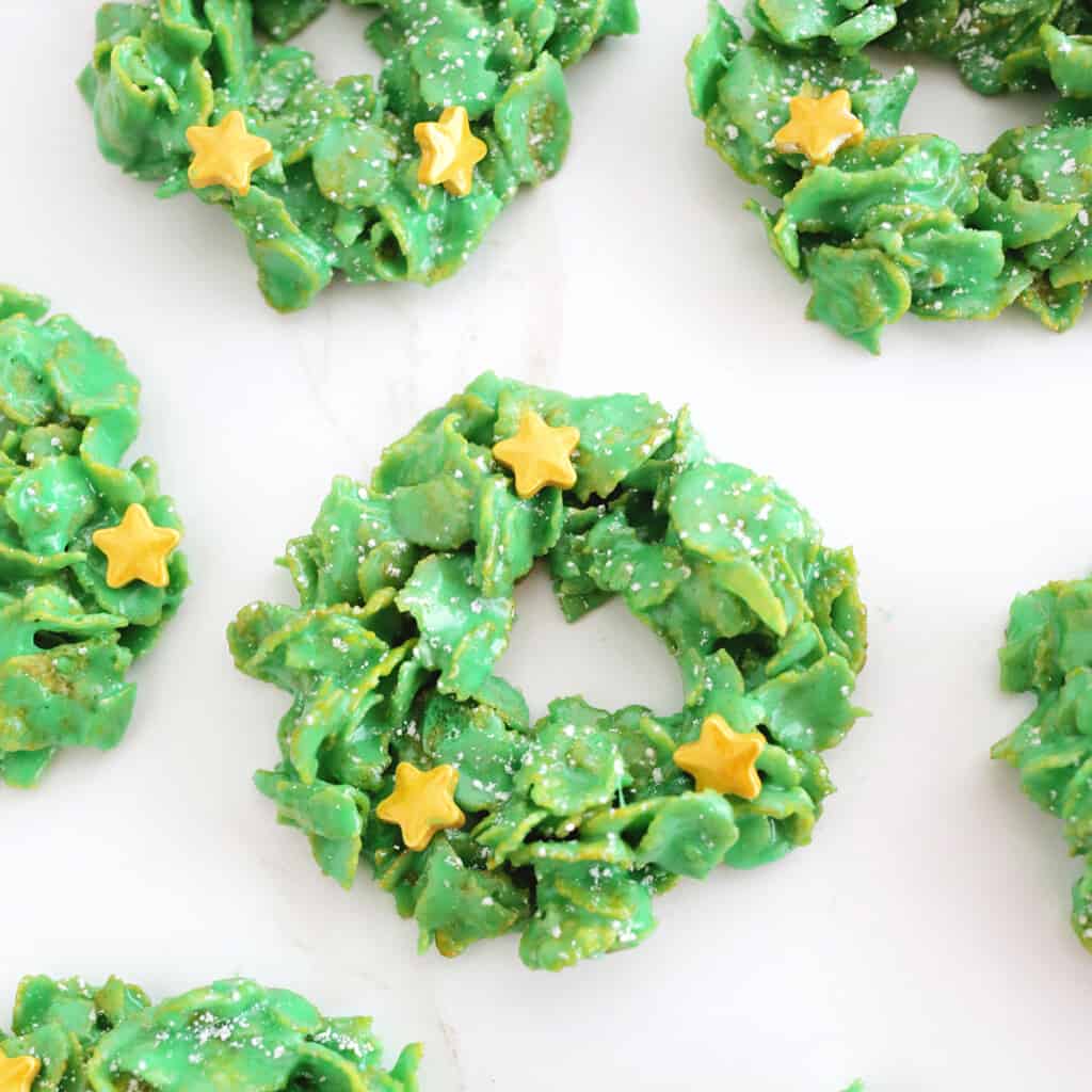 Easy Christmas wreath cookies made from cornflake cereal with a marshmallow coating.