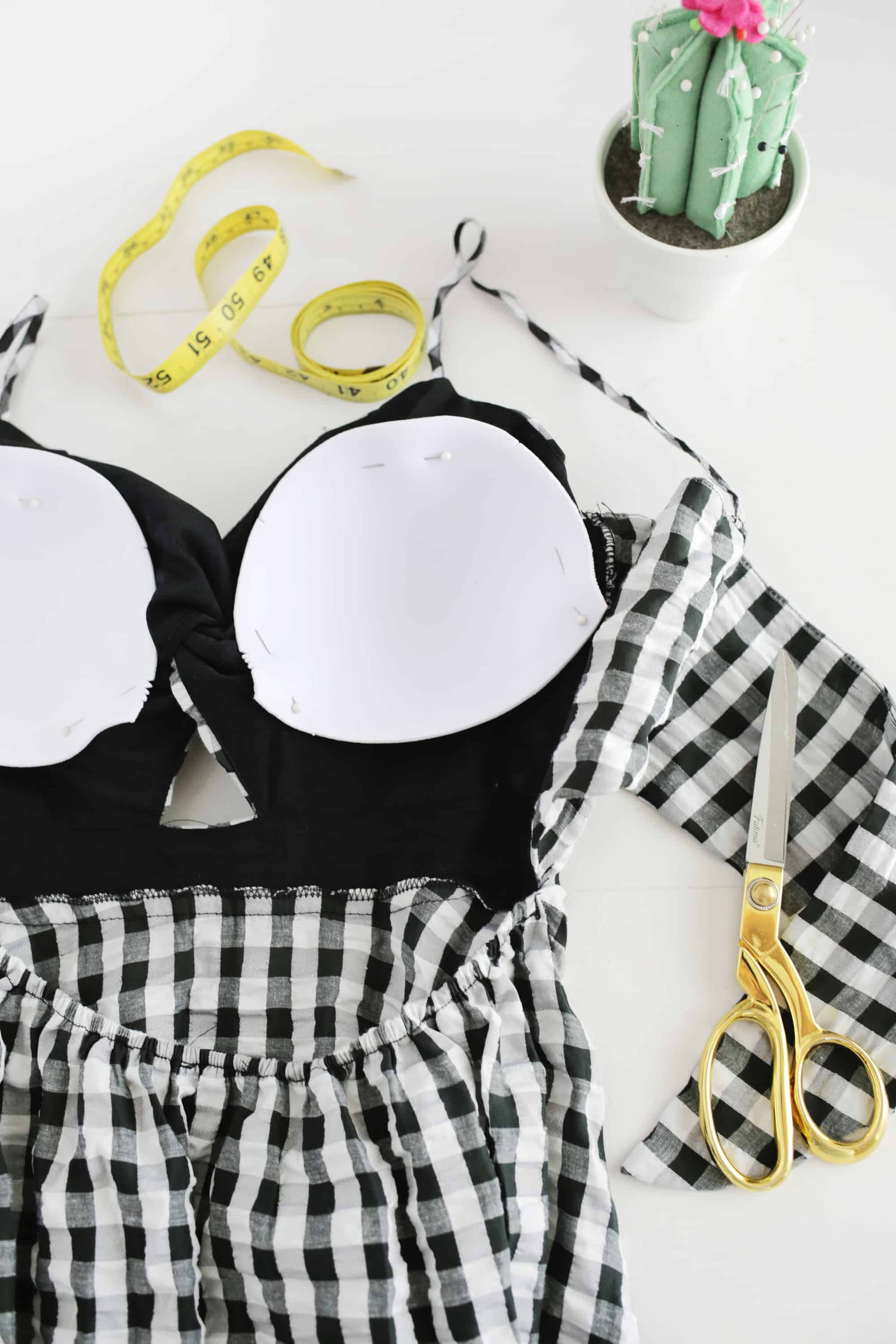- Try your garment on and assess where you would want the cups to be. Pin the cups in place, and gently try the item back on to make sure you like the cup location.