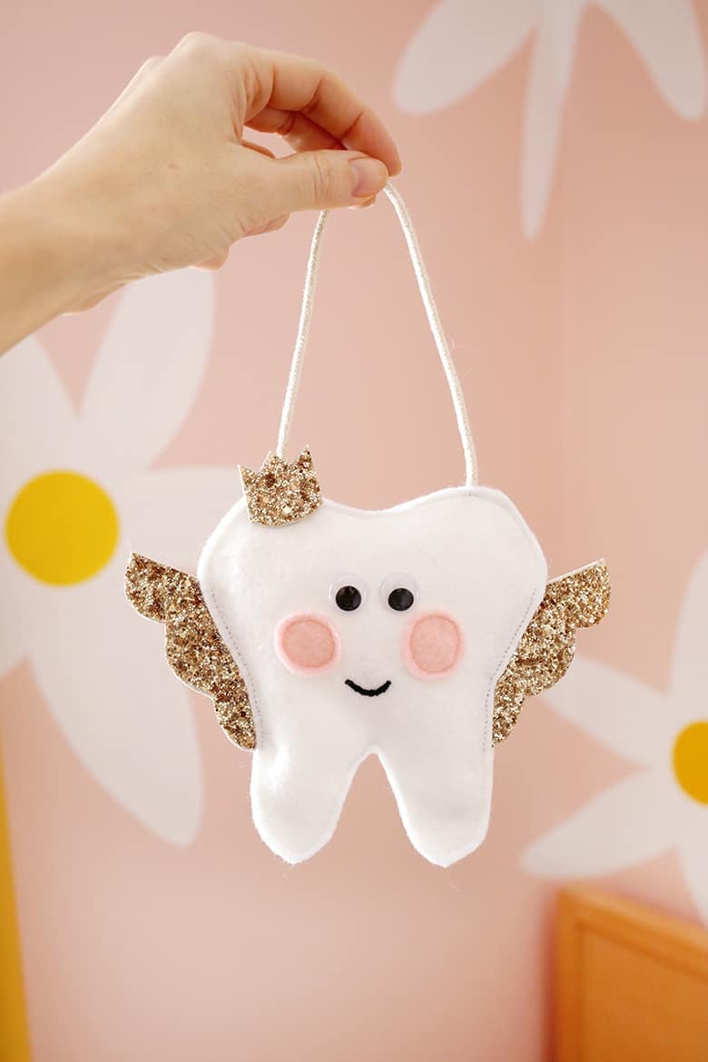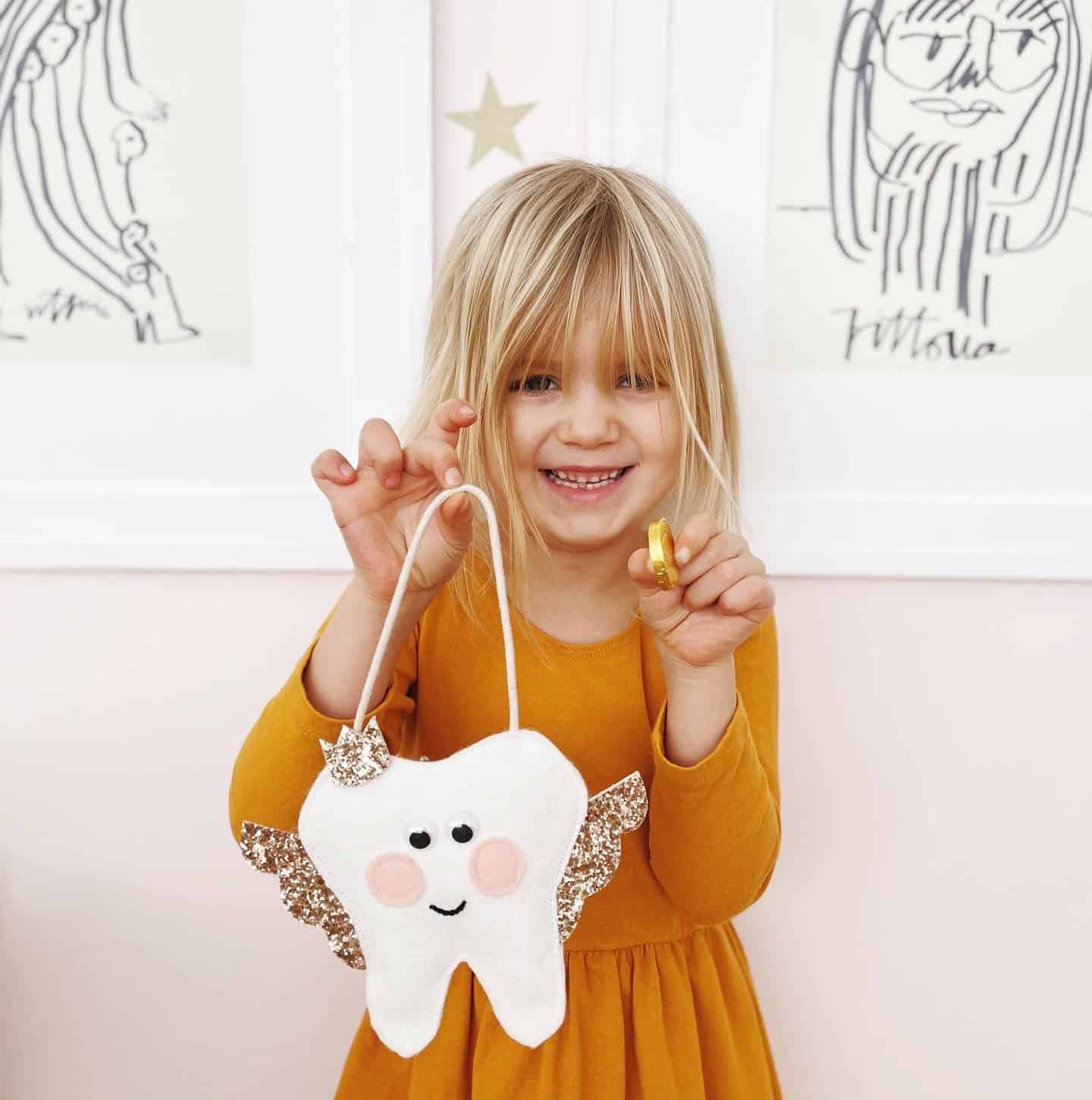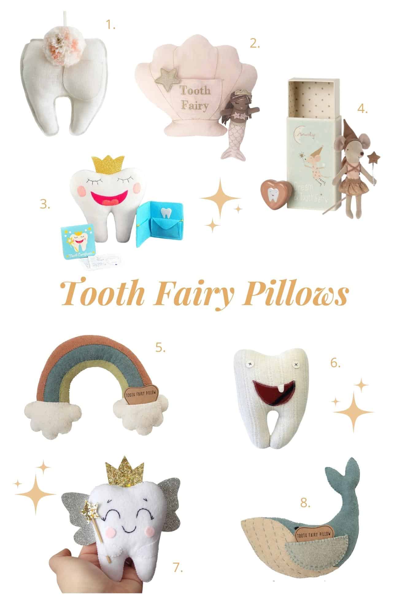 A: A Tooth Fairy pillow is a small pillow or plush doll-type tooth that has a pocket for you to put your little one’s tiny tooth in so it doesn’t get lost under their pillow while they sleep (their teeth are so tiny!). You can replace the tooth with a gift from the Tooth Fairy!