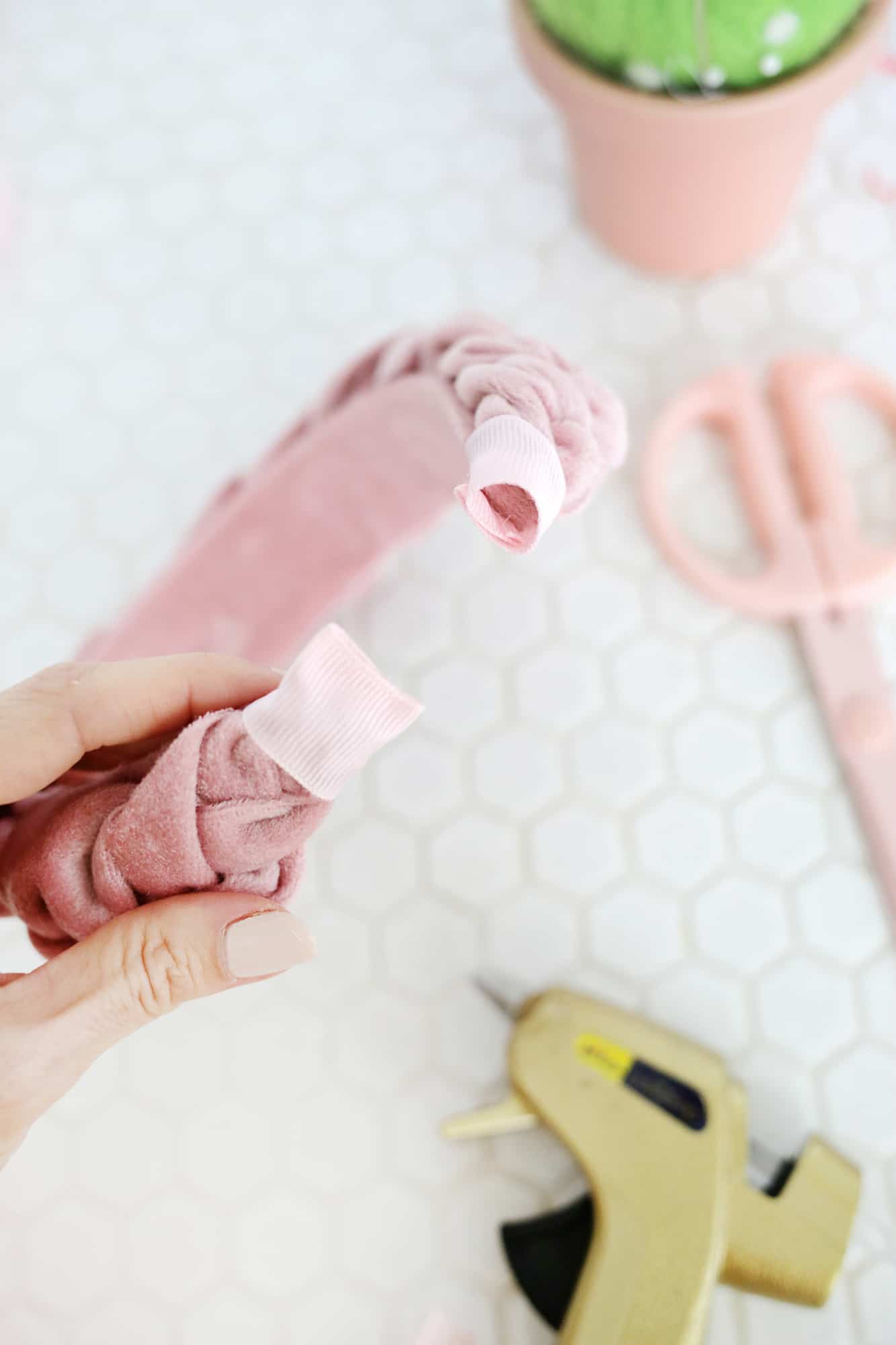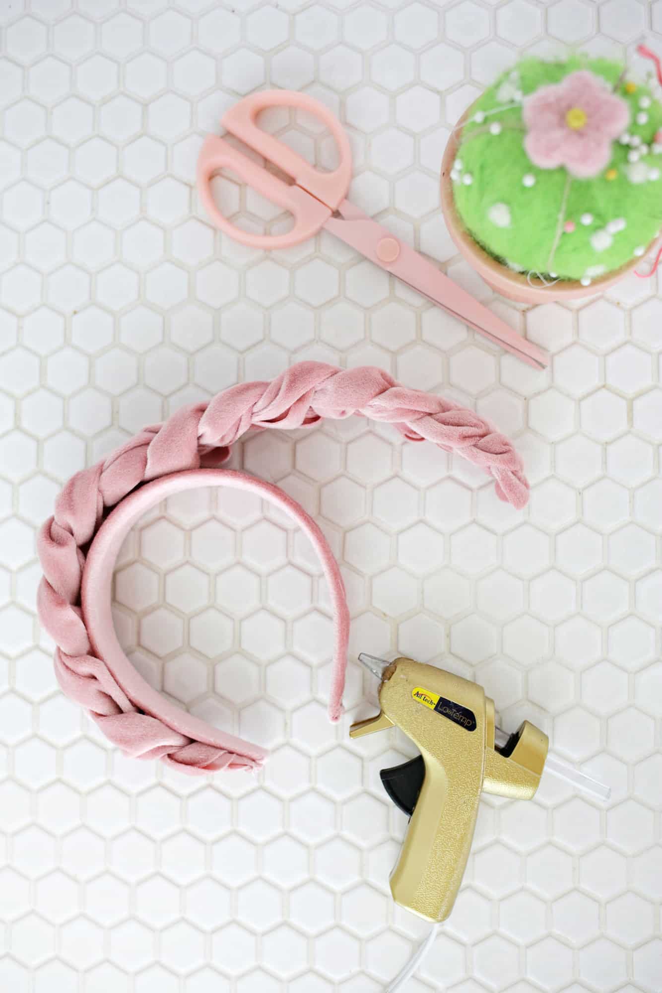 Now that your braid is the right length and tapered, glue it to the topside of your velvet headband with a generous amount of hot glue.