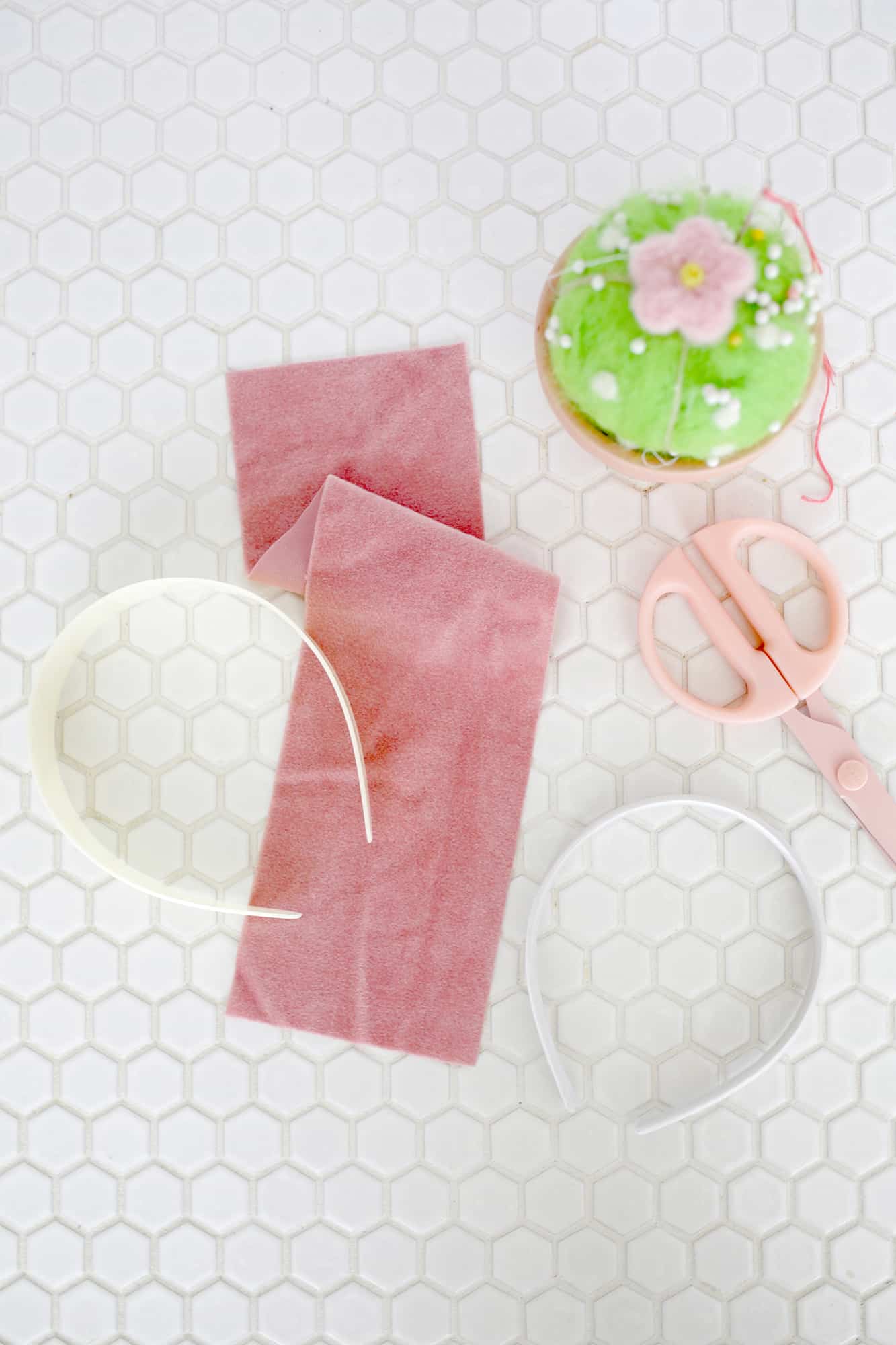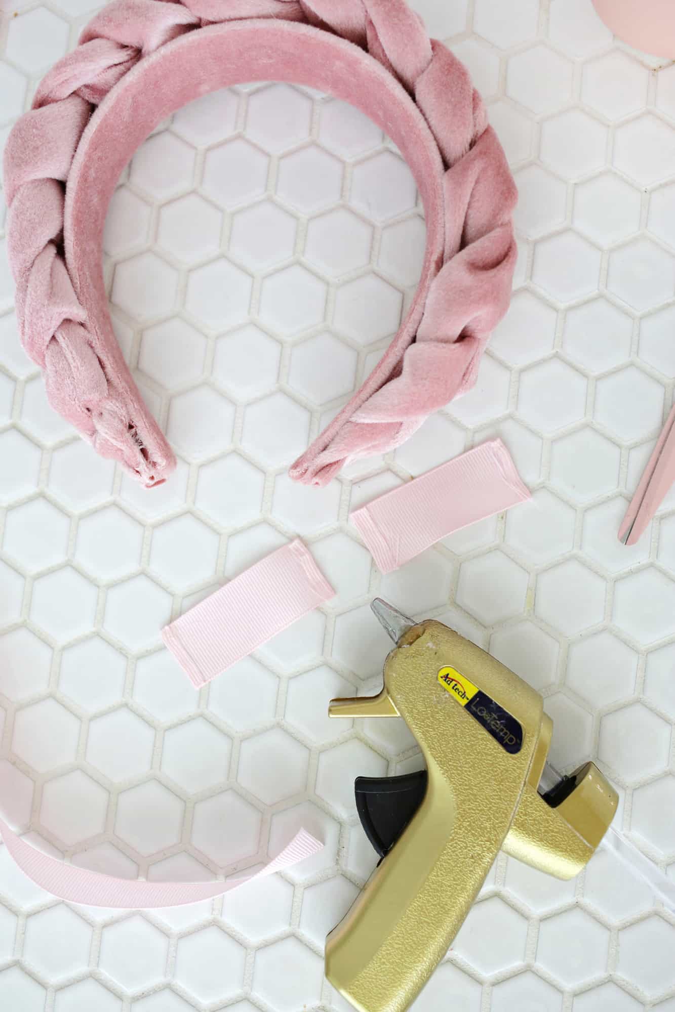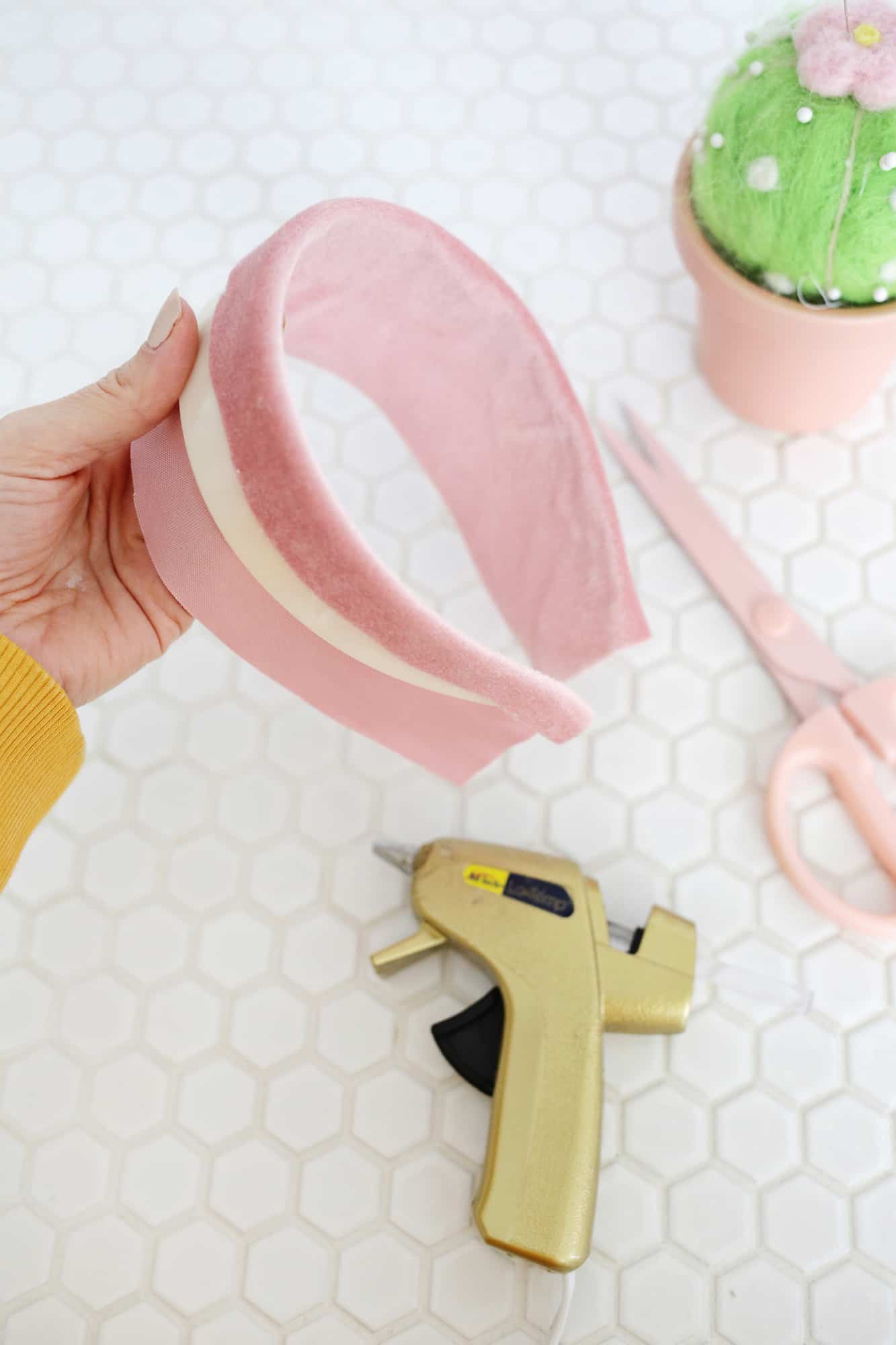 Place your headband in the middle of the velvet so it’s covering the underside and use your hot glue to glue the velvet to the length of the underside of the headband.