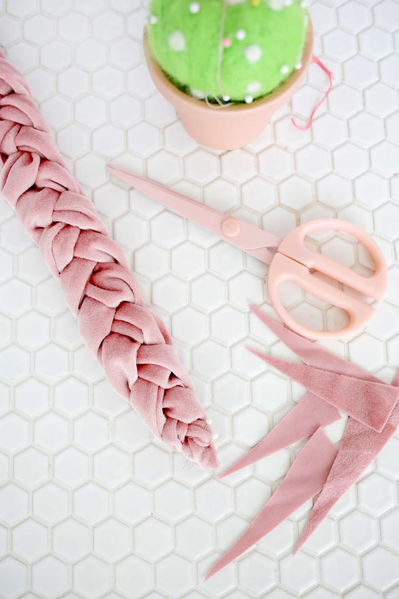 - For the wider headband, cut three strips of velvet that are 25″ long and 4″ wide (and for the smaller headband cut them 25″ long and 3″ wide). Fold your strips in half lengthwise and stack the three strips on top of each other so you can braid them together. Use a straight pin to keep the three strips together and set something heavy on that end so you can braid the tails (you could set it under a couch leg or something while you braid or get someone else to hold it for you). You’ll want to twist the strands so that the cut side of the fabric stays on the bottom side at all times, so just keep checking that your cut ends are hidden and twist/rotate the fabric as needed to make that happen.