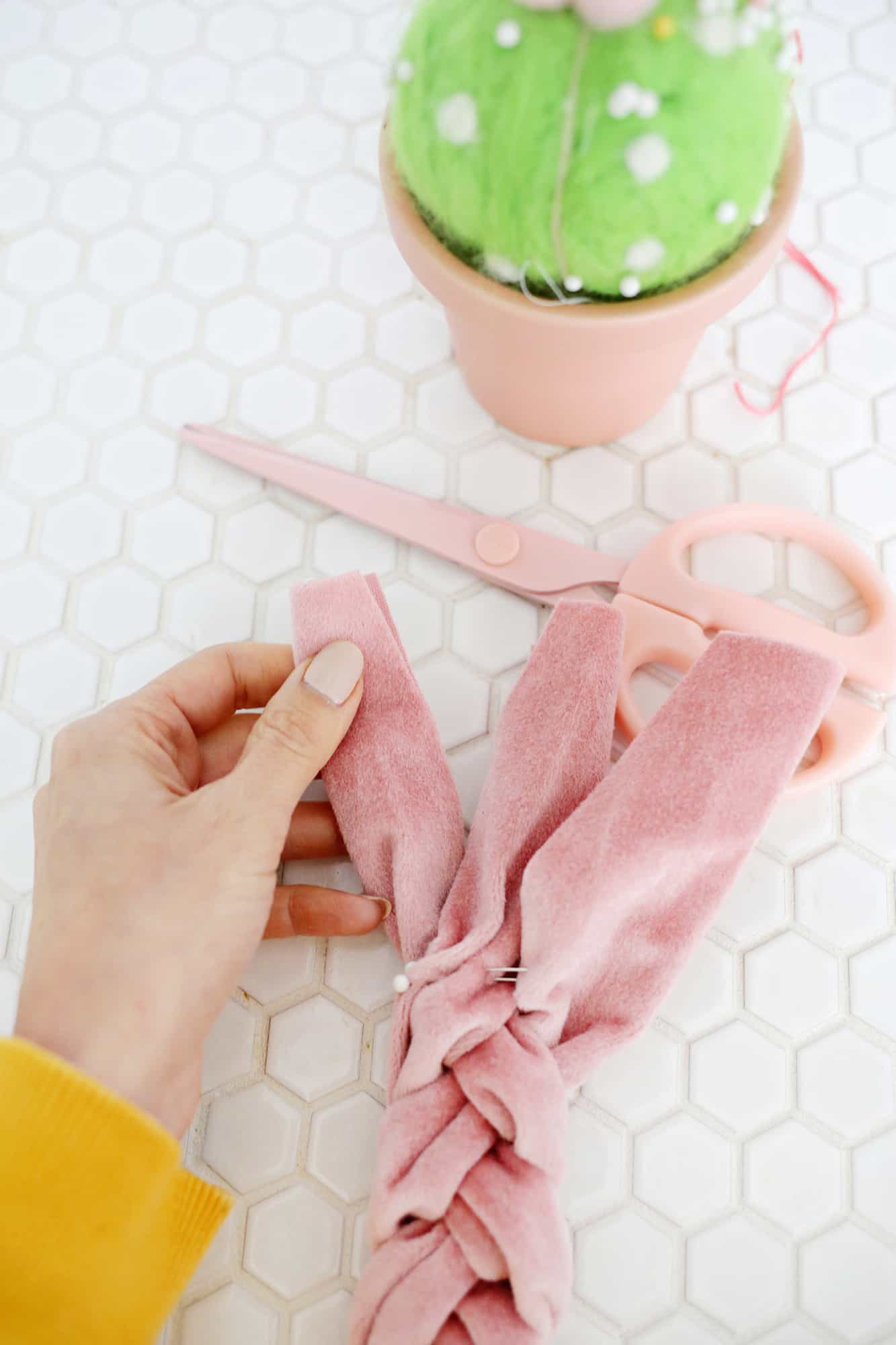 - Once your braid is complete, place it against your headband to check the length and trim it if it’s longer than your headband length. Once you have a good length, you can unbraid the last 3″ of each end to gradually cut some of the fabric strip width off of the ends of the tails (as you see above in the photo). That will make the ends less bulky and tapered a bit as the braid ends on each side.