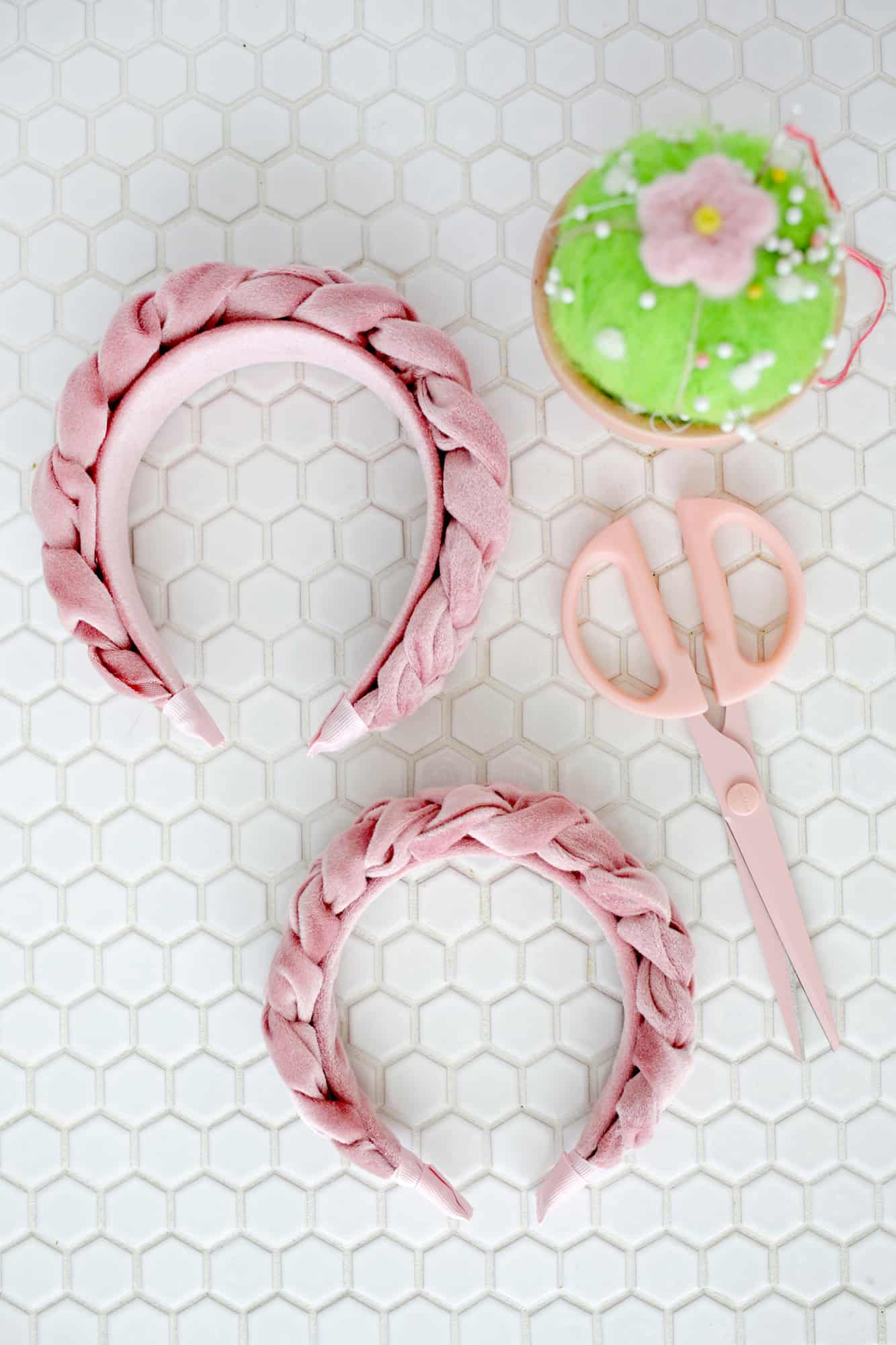 Once your braid is complete, place it against your headband to check the length and trim it if it’s longer than your headband length. Once you have a good length, you can unbraid the last 3″ of each end to gradually cut some of the fabric strip width off of the ends of the tails (as you see above in the photo). That will make the ends less bulky and tapered a bit as the braid ends on each side.