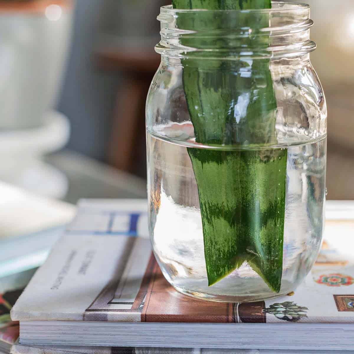 Grab a glass vase or jar and stick your newly cut leaf in it. I like to sill my water about 4 inches above the bottom of my freshly cut leaf. Keep your plant in the water and watch little roots start to sprout!