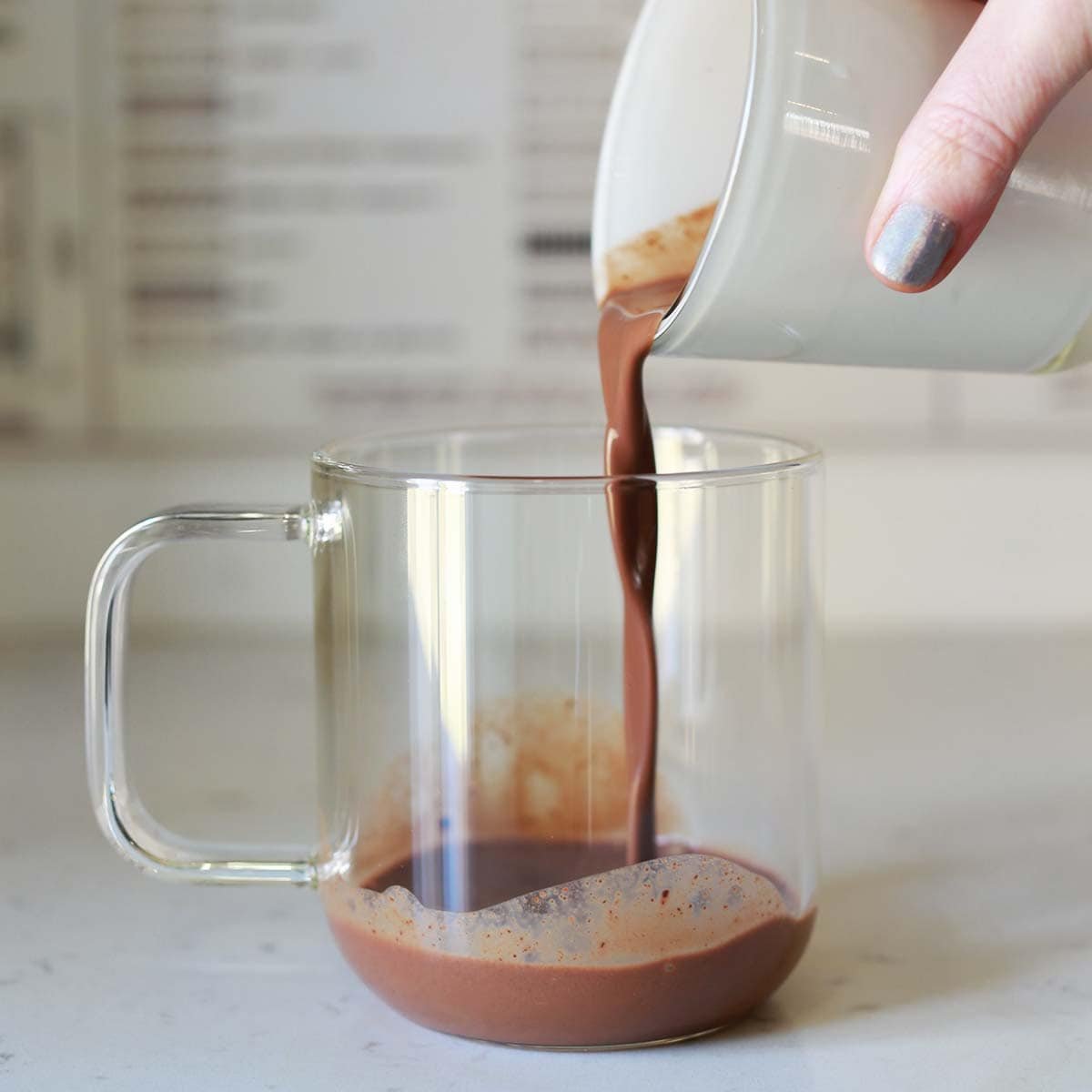 Mix together the brown sugar, cocoa, cinnamon, cayenne and milk. The goal is to dissolve the sugar and fully incorporate the other ingredients so no lumps remain. I think adding all the ingredients to a jar with a lid and shaking well works great, or you could use a small whisk or milk frothing wand.