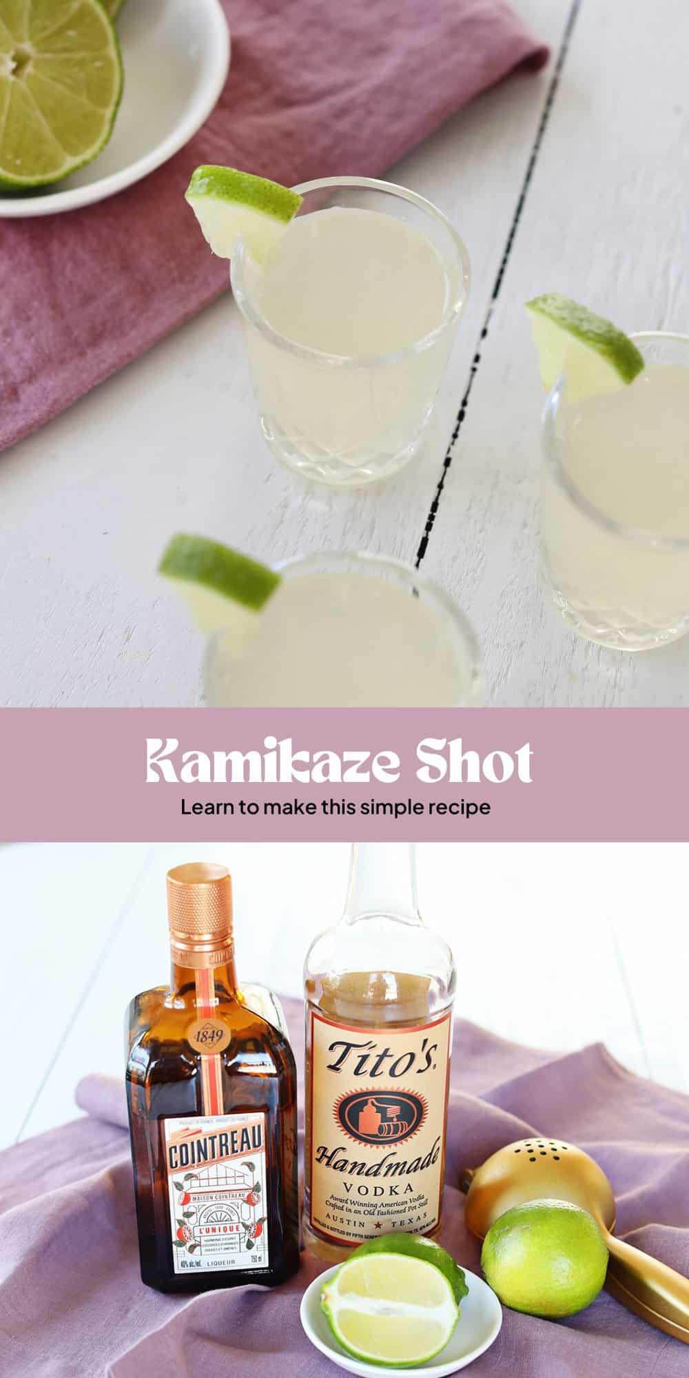 - Kamikaze Cocktail To turn this shot into a cocktail, keep the recipe exactly the same, but increase the lime juice to 1 full ounce. Serve in a martini glass.