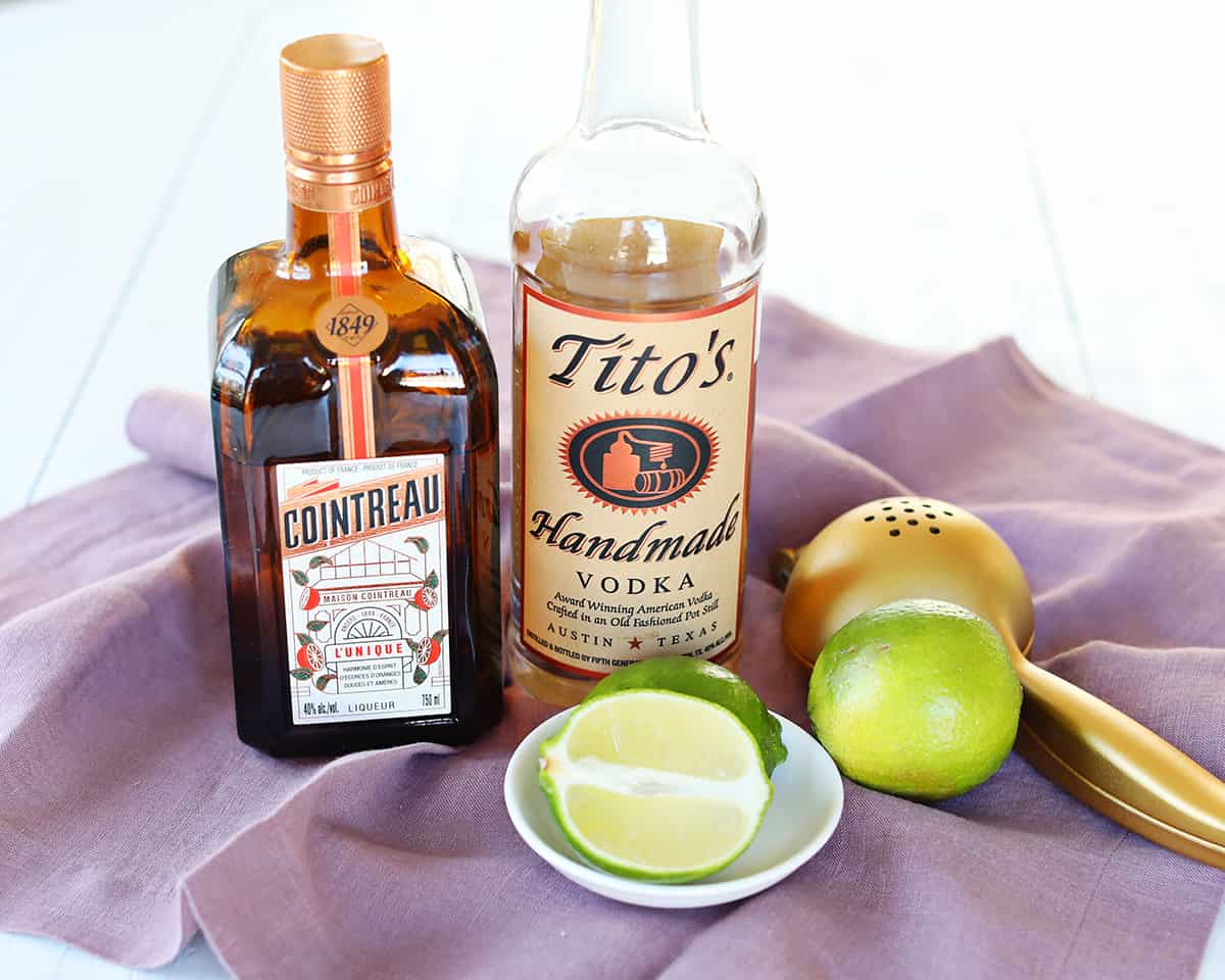- In a cocktail shaker filled with ice combine vodka, orange liqueur and lime juice.