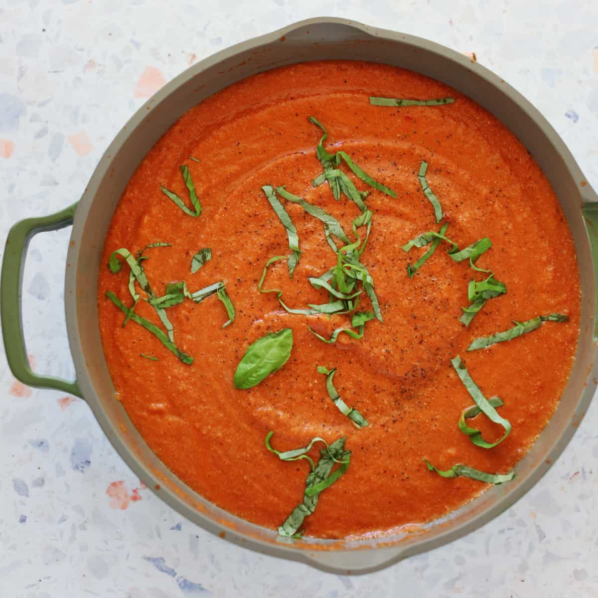 Cook the onion and garlic (aromatics) first. Then, add the stewed tomatoes, tomato paste, and vodka. Blend the sauce together with an immersion blender or in a blender. Finally, stir in the cream and you’re ready for dinner!