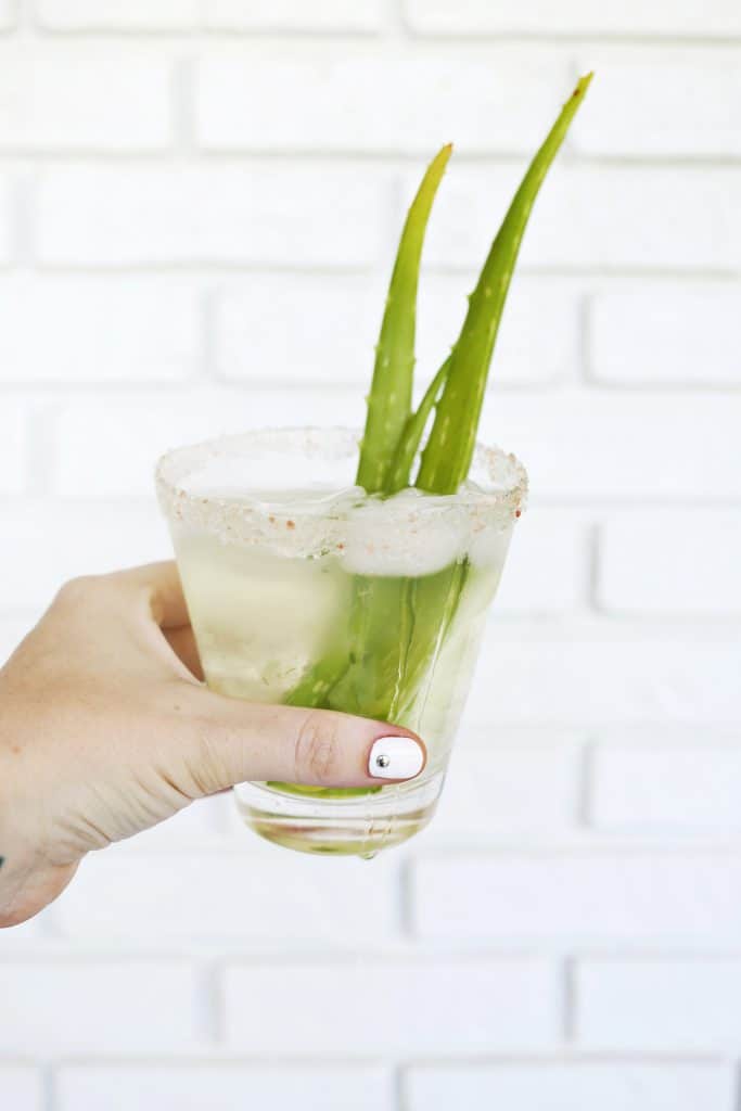 Yes, you’re reading it right! Our aloe margarita recipe is unique, light, and fresh. Garnish the rim with pink sea salt and a piece of organic aloe to make it extra fun.
