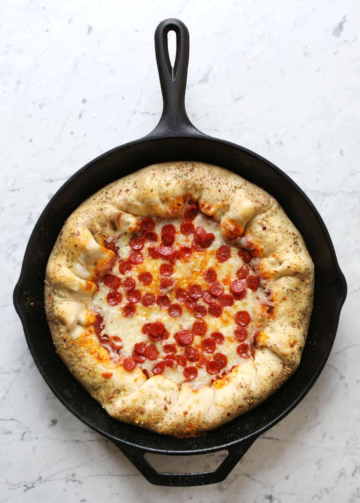 It’s an extra special deep dish cast iron pizza because it’s stuffed crust! I love stuffed crust pizza—it’s got some childhood nostalgia for me.
