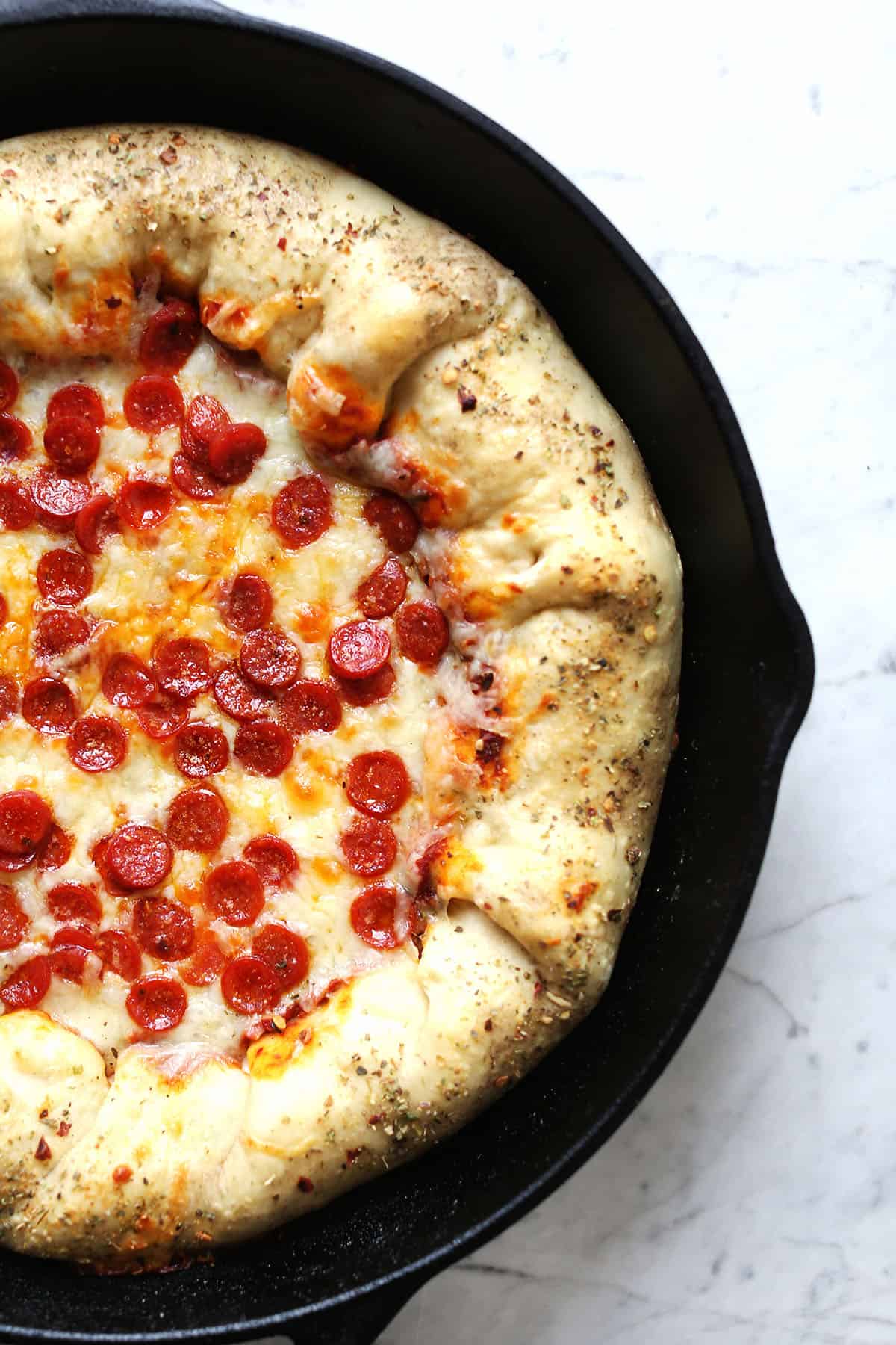 Have you ever tried making pizza in a cast iron pan? It’s awesome, and you should try it. This stuffed crust cast iron pan pizza recipe is extra special but I promise it’s also very easy to make.