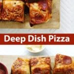 If you love pizza as much as we do you have to try our Deep Dish Pizza recipe. This deep dish pizza recipe is everything I love about pizza with a thicker crust. This pizza gets baked in a square baking dish, and I like to cut the pizza into small squares before serving. Layers of pizza sauce, cheese and toppings melt together for the perfect bit.